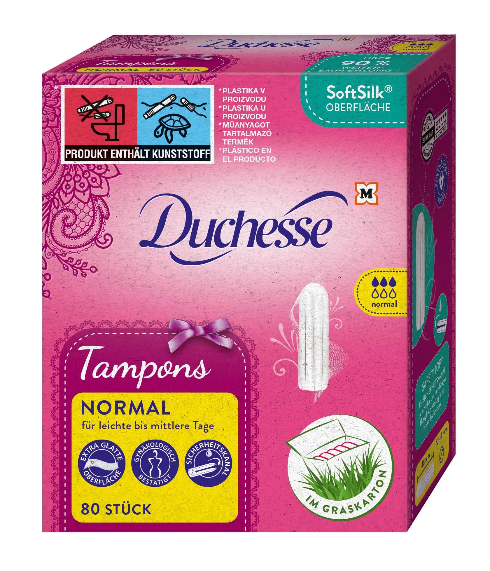 Müller EigenmarkeDuchesse Tampons Normal im Graskarton2,65 € / 80 Stk.0,33 € / 10 Stk.Online verfügbarIn die Filiale lieferbar