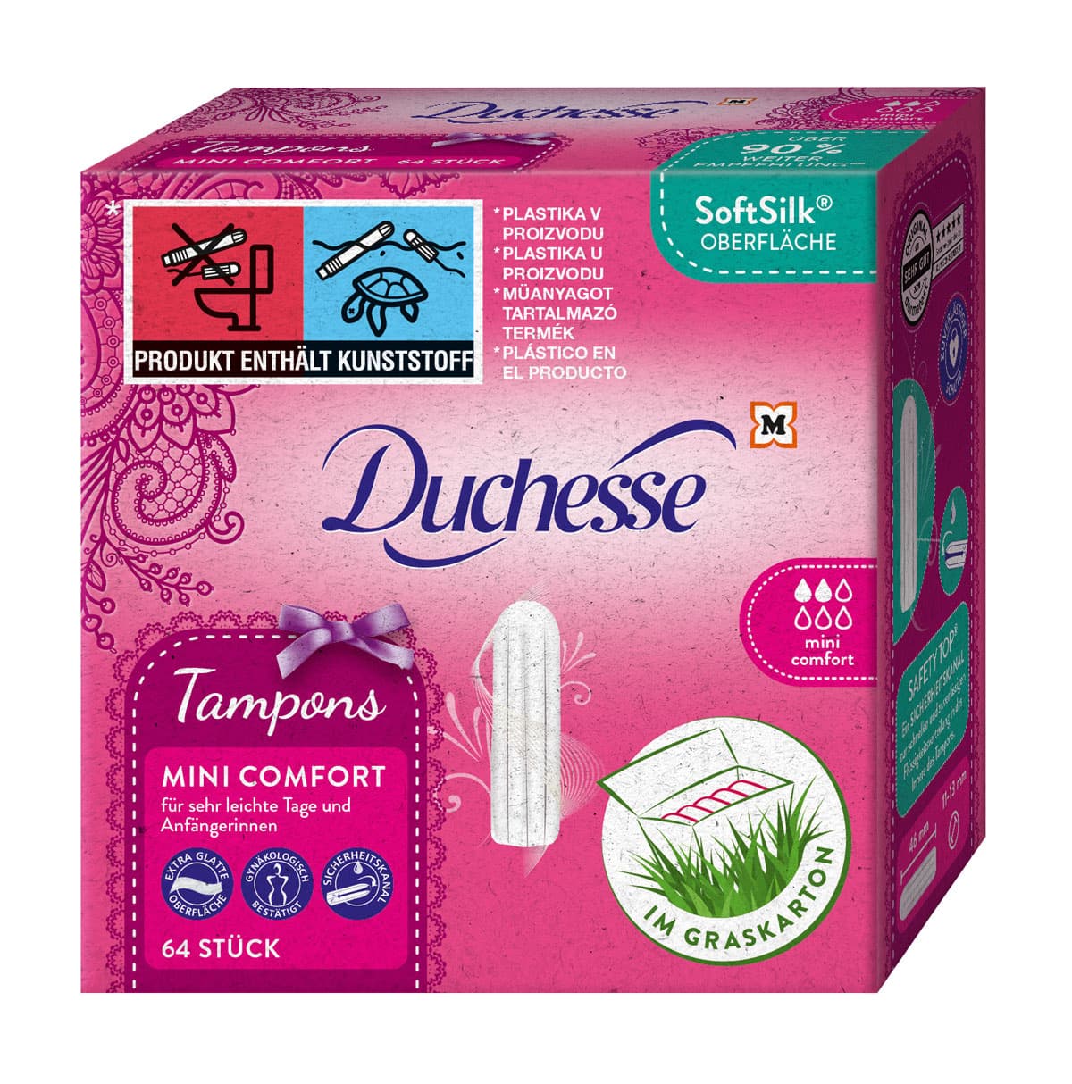 Müller EigenmarkeDuchesse Tampons S Mini Comfort3,70 € / 64 Stk.0,58 € / 10 Stk.Online verfügbarIn die Filiale lieferbar