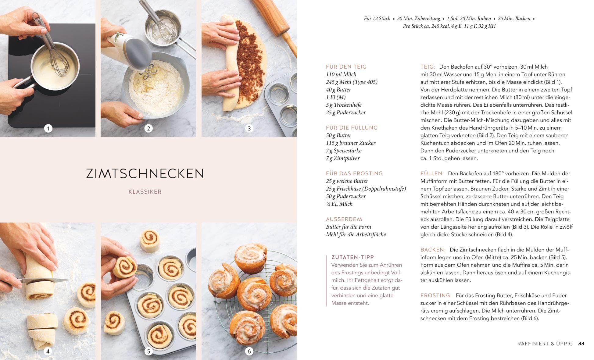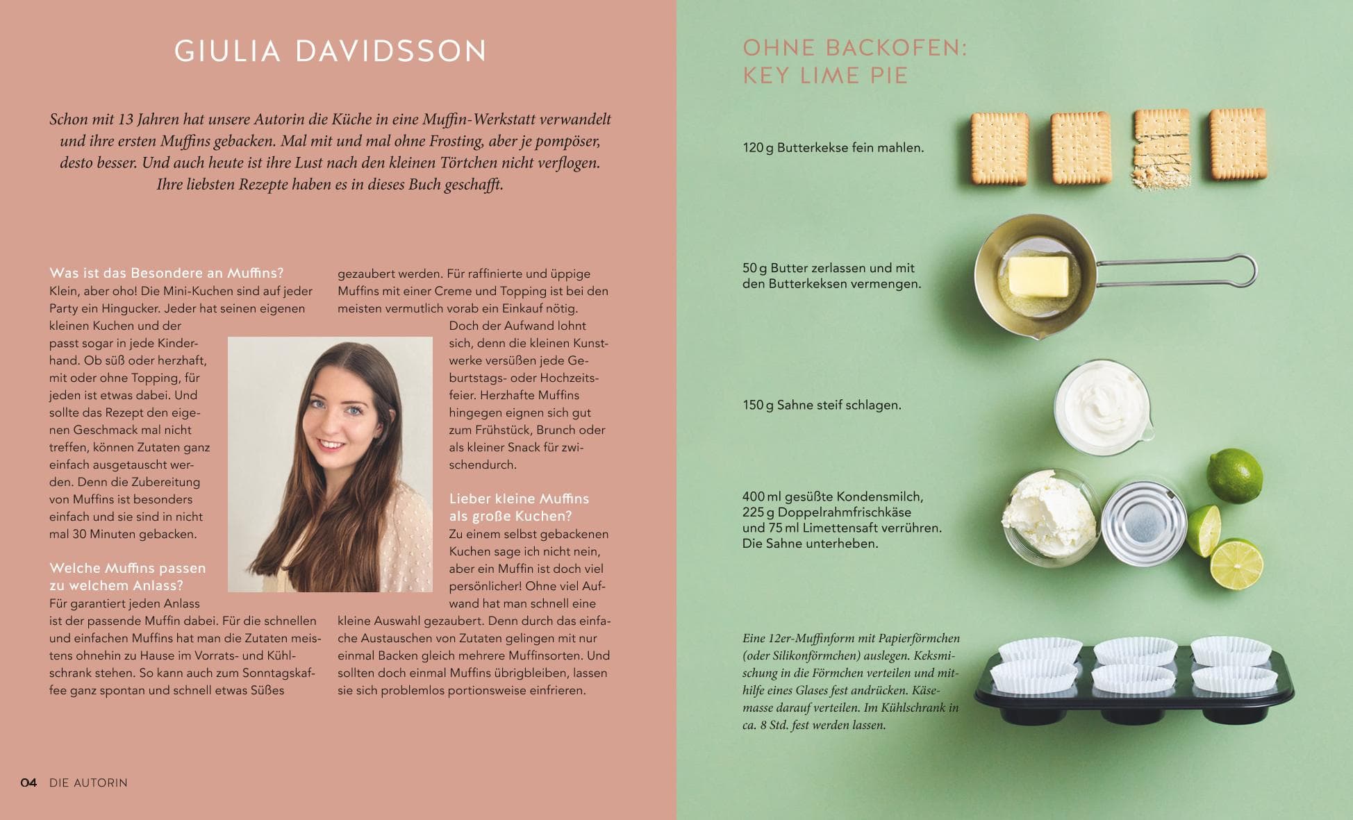 Wenig Zutaten – leichte Rezepte – aber so viel Genuss! Das verspricht das neue Backbuch mit 50 kreativen Muffinrezepten! Die kleinen Küchlein sind nicht nur bei Kindern beliebt, sondern auch bei Kollegen, Freunden und auf der Kaffeetafel mit Verwandten. Sie lassen sich unterwegs gut essen, passen zu einem Picknick und können mit aufwendigem Topping sogar auf einer Hochzeitstafel glänzen. Lust auf neue Rezepte? Konditorin Giulia Davidsson zeigt, wie sich aus wenigen Zutaten und wenig Zeitaufwand absolut köstliche Muffins zaubern lassen. Außerdem stellt sie nützliche Backhelfer, kreative Toppings sowie perfekte Kombinationen vor. Freuen Sie sich auf 50 Rezepte aus der Muffinform! Schnell&Einfach Ganz egal, ob Sie Muffins mit Obst lieben, auf Nüsse stehen oder Schokolade Ihre Lieblingszutat ist. Das Backbuch bedient alle Geschmäcker und zeigt, wie man Muffins auch vegan backen kann. Probieren Sie aus der Kategorie Blitzrezepte unbedingt: Brombeer-Mohn-Cupcakes Matcha-Käsekuchen Himbeer-Zitronen-Muffins Marmormuffins Raffiniert&Üppig Manchmal darf es etwas mehr sein: zum Beispiel ein Cupcake-Topping, eine Deko aus Zuckerguss oder mit Creme gefüllte Schokocups. Die Törtchen aus dieser Kategorie – die sich immer in einem klassischen Muffinblech backen lassen, imponieren Freunden und Kollegen. Donauwellencupcakes Bienenstichmuffins Brownies mit Salzkaramell Chocolate-Chip-Cupcakes Herzhaft&Pikant Das Muffins nicht nur süß etwas hermachen, ist lange bekannt. Doch auch die herzhaften und würzigen Backwerke sollen mit Saftigkeit und viel Geschmack überzeugen. Die Autorin des Kochbuches verrät, wie Sie genau diese Besonderheit zaubert und zeigt, wie köstlich Pestomuffins mit Pinienkernen Chili-sin-carne-Muffins Spaghetti-Carbonara-Muffins schmecken können.