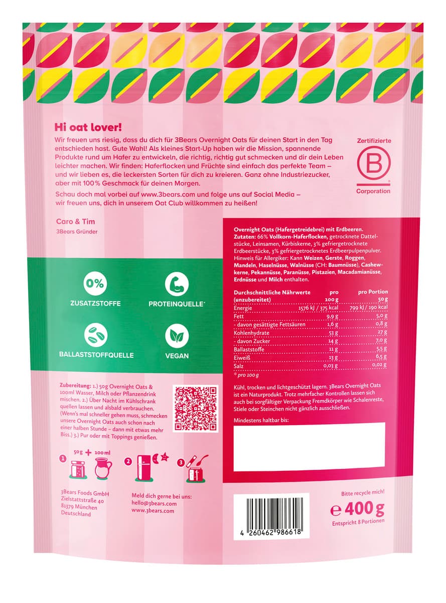 | Zubereitungshinweis | 1. 50g Overnight Oats & 100ml Wasser, Milch oder Pflanzendrink mischen. 2. Über Nacht im Kühlschrank quellen lassen. Wenn’s mal schneller gehen muss, schmecken unsere Overnight Oats auch schon nach einer halben Stunde–dann mit etwas mehr Biss. 3. Pur oder mit Toppings genießen. |