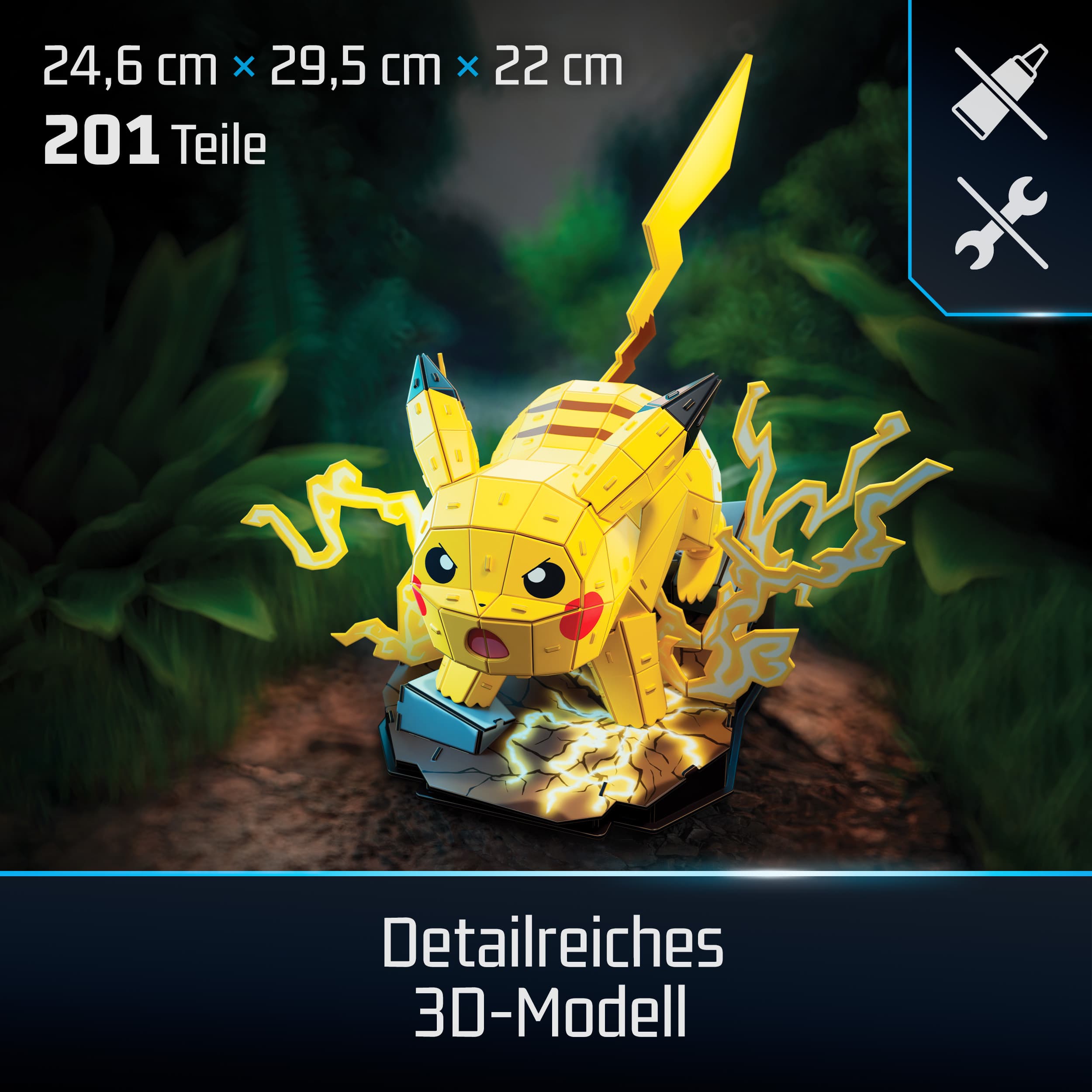 Erwecke die beliebte Pokémon Figur Pikachu zum Leben - mit diesem 3D-Modellbausatz aus hochwertigem Karton. Mit 201 stabilen Ausstanz-Teilen garantiert der Modellbausatz Spaß schon beim Aufbauen, denn das Modell lässt sich kinderleicht zusammenstecken, es sind keine Werkzeuge erforderlich. Das originalgetreue 3D-Modell ist der Blickfang in jedem Raum und ein beliebtes Sammlerobjekt für alle Pokémon Fans. Maße des aufgebauten Modells: 30 x 25 x 33 cm. Empfohlen ab 12 Jahren.