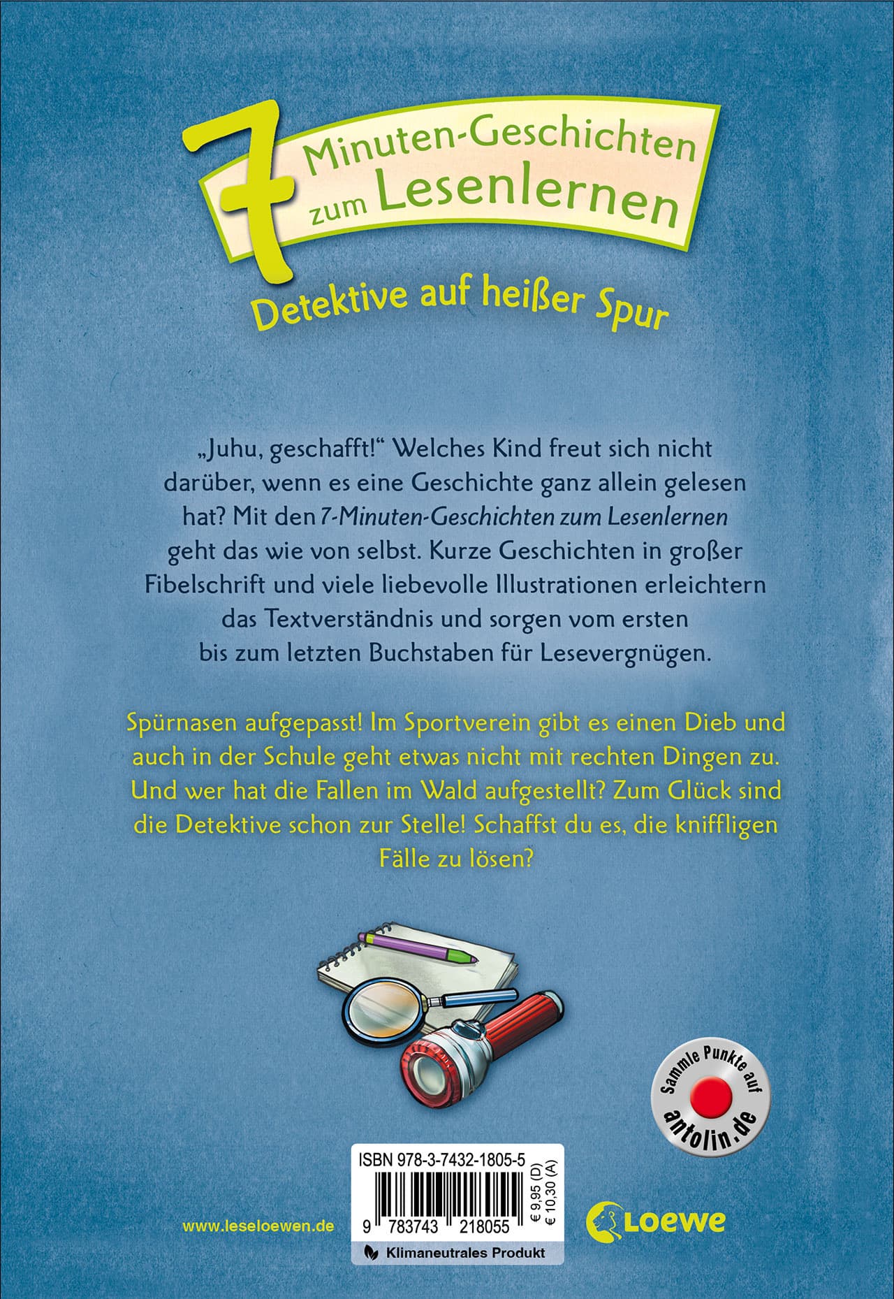 Detektive aufgepasst! „Juhu, geschafft!“ Welches Kind freut sich nicht darüber, wenn es eine Geschichte ganz allein gelesen hat? Mit den 7-Minuten-Geschichten zum Lesenlernen geht das wie von selbst. Kurze Geschichten in großer Fibelschrift und viele liebevolle Illustrationen erleichtern das Textverständnis und sorgen vom ersten bis zum letzten Buchstaben für Lesevergnügen. Spürnasen aufgepasst! Im Sportverein gibt es einen Dieb und auch in der Schule geht etwas nicht mit rechten Dingen zu. Und wer hat die Fallen im Wald aufgestellt? Zum Glück sind die Detektive schon zur Stelle! Schaffst du es, die kniffligen Fälle zu lösen? Entdecke den Spaß am Lesen mit vielen kurzen Geschichten! spannende Detektivgeschichten und kurze Kinderkrimis für Kinder ab 6 Jahren kurze Geschichten schneller Leseerfolg viele bunte Bilder zum Vorlesen und ersten Selberlesen von Lehrern empfohlen Quizfragen auf Antolin