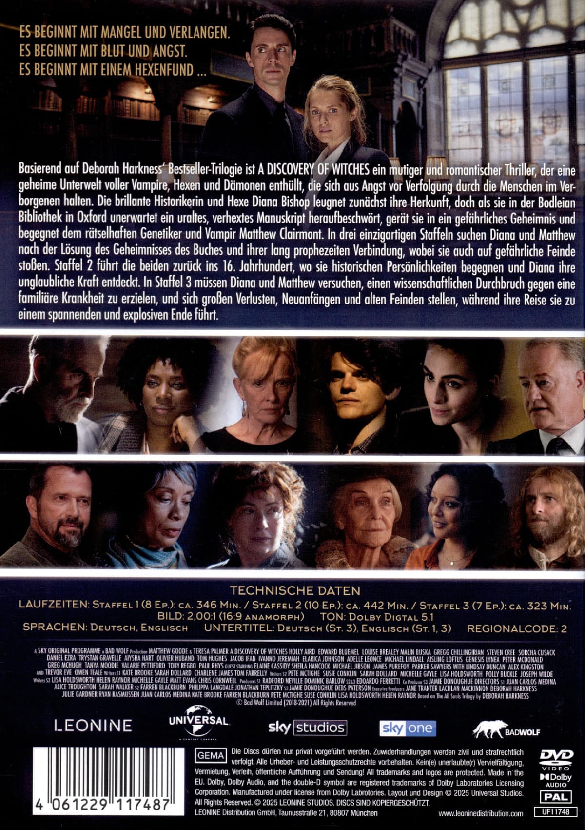Basierend auf Deborah Harkness' Bestseller-Trilogie ist A DISCOVERY OF WITCHES ein mutiger und romantischer Thriller, der eine geheime Unterwelt voller Vampire, Hexen und Dämonen enthüllt, die sich aus Angst vor Verfolgung durch die Menschen im Verborgenen halten. Die brillante Historikerin und Hexe Diana Bishop leugnet zunächst ihre Herkunft, doch als sie in der Bodleian Bibliothek in Oxford unerwartet ein uraltes, verhextes Manuskript heraufbeschwört, gerät sie in ein gefährliches Geheimnis und begegnet dem rätselhaften Genetiker und Vampir Matthew Clairmont. In drei einzigartigen Staffeln suchen Diana und Matthew nach der Lösung des Geheimnisses des Buches und ihrer lang prophezeiten Verbindung, wobei sie auch auf gefährliche Feinde stoßen. Staffel 2 führt die beiden zurück ins 16. Jahrhundert, wo sie historischen Persönlichkeiten begegnen und Diana ihre unglaubliche Kraft entdeckt. In Staffel 3 müssen Diana und Matthew versuchen, einen wissenschaftlichen Durchbruch gegen eine familiäre Krankheit zu erzielen, und sich großen Verlusten, Neuanfängen und alten Feinden stellen, während ihre Reise sie zu einem spannenden und explosiven Ende führt.