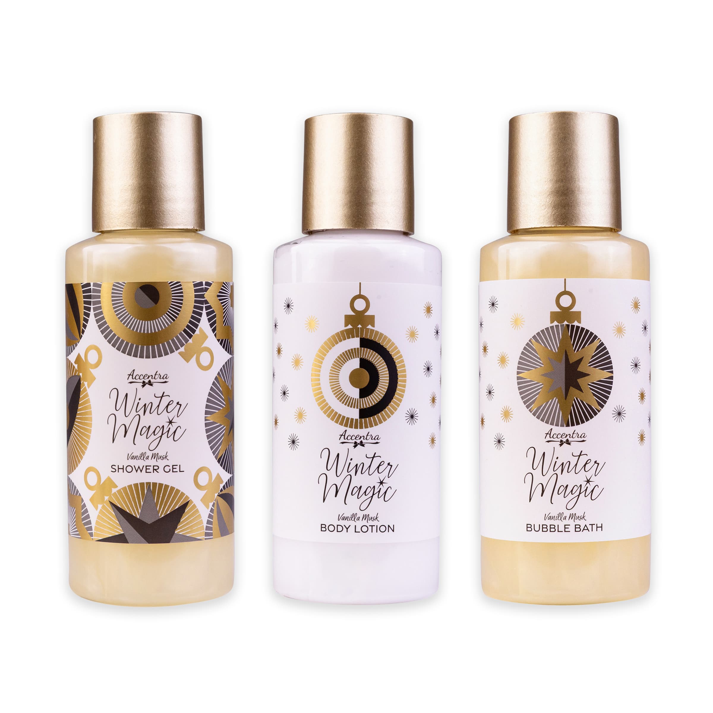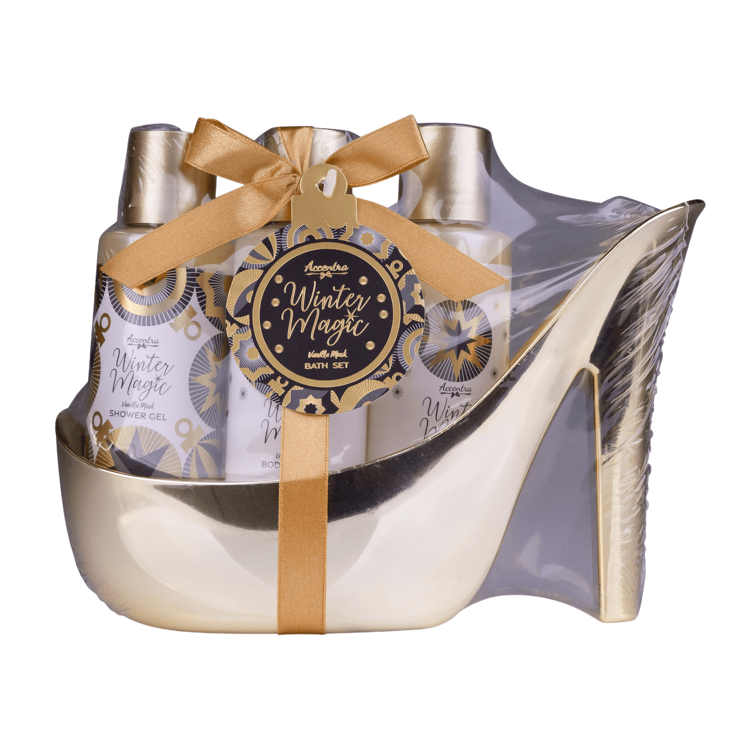 Das Geschenkset WINTER MAGIC in den edlen Farben Gold, Weiß und Schwarz ist ein echter Blickfang. Die luxuriöse Vanilla-Musk-Duftnote verzaubert die Sinne. Das Set ist stylisch in einem goldenen Kunststoff-Pump verpackt und eignet sich perfekt als stilvolles Geschenk.