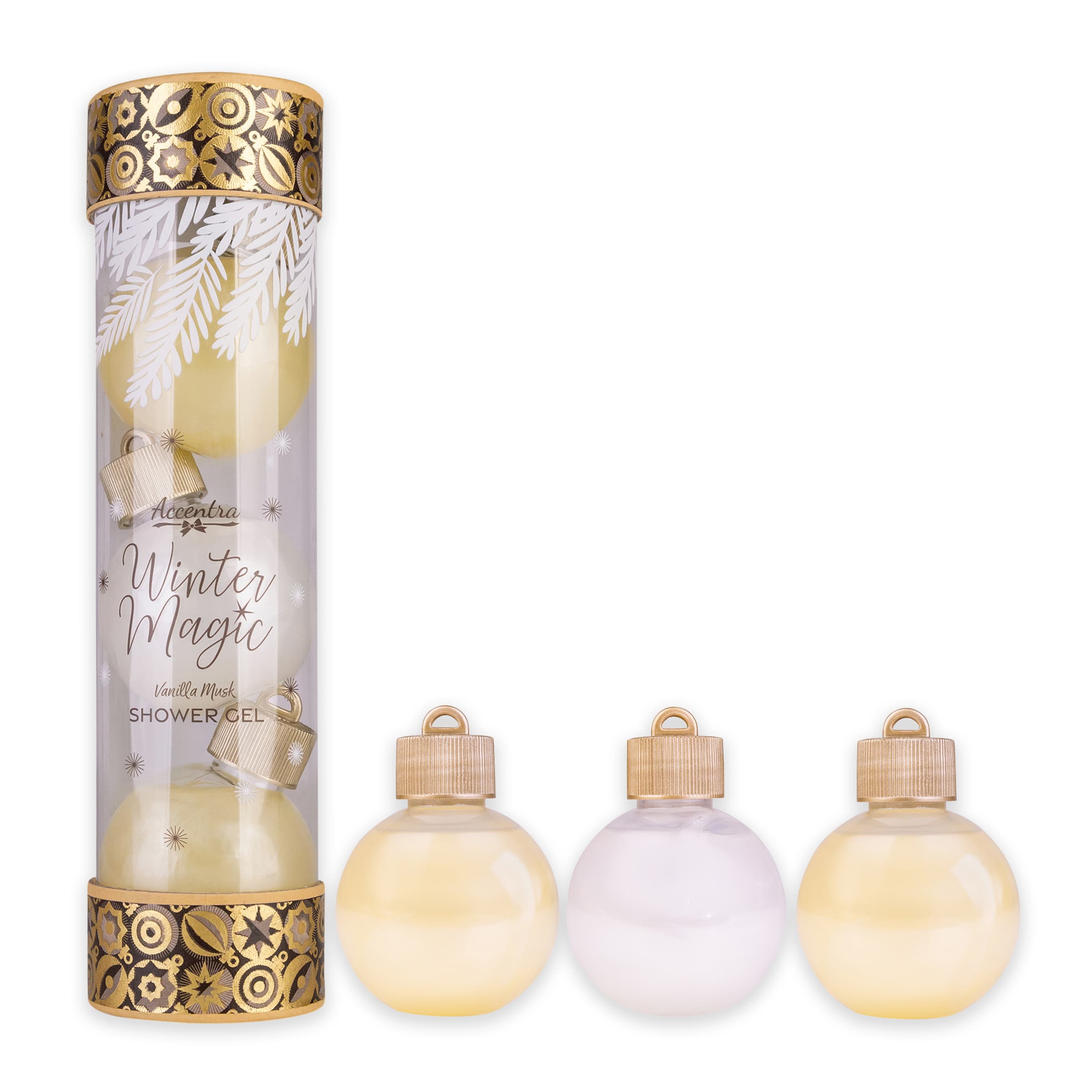 Dieses elegante WINTER MAGIC Duschgel-Set ist in den Farben Gold und Weiß gehalten und überzeugt durch sein stilvolles Design in Form von Kristbaumkugeln. Die 3 x 60ml Duschgele enhalten einen luxuriösen Duft nach Vanilla Musk. Die weihnachtlichen, befüllten Kugeln im inneren des Sets eignet sich ideal als Dekoration zum Aufhängen, insbesondere in der Winterzeit.
