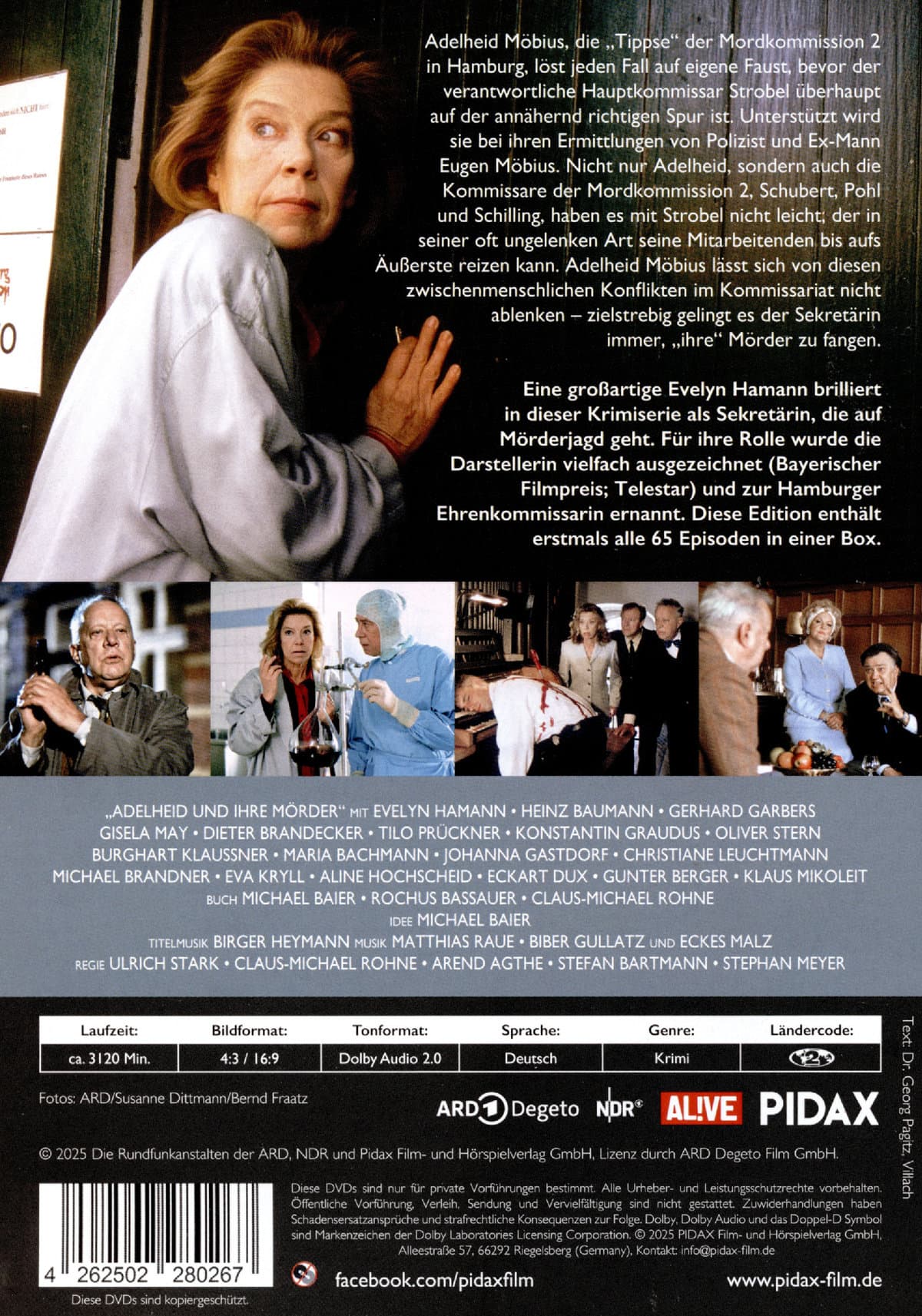 Adelheid Möbius, die „Tippse“ der Mordkommission 2 Hamburg, mischt sich ständig in die Ermittlungen ihres Chefs Ewald Strobel ein und löst jeden Fall auf eigene Faust, bevor der Hauptkommissar auf der richti gen Spur ist. Unterstützt wird sie dabei von ihrem Ex-Mann Eugen, der ihr stets als Fahrer dient. Aber nicht nur Adelheid, sondern auch die Kommissare Schubert, Pohl und Schilling, haben es mit dem stets schlechtgelaunten, alles besserwissenden Strobel nicht einfach, der in seiner oft tollpatschigen Art seine Mitarbeiter bis aufs Äußerste schikaniert. Dennoch gelingt es seiner Sekretärin ständig, „ihre“ Mörder zu fangen ... Folgen: 01. 39 rote Rosen 02. Amazonas 03. Kleine Fische 04. Tod in der Geisterbahn 05. Liebe, Tod und Leidenschaft 06. Tod auf Bestellung 07. Zwei links, zwei rechts 08. Blaubarts letzte Frau 09. Mord stand nicht auf dem Programm 10. Die schöne Lydia 11. Wellenlänge Mord 12. Ein Schritt zu viel 13. Die letzte Tasse 14. Hochzeitsnacht im Sarg 15. Mord mit Monogramm 16. Der letzte Akt 17. Schuß in den Ofen 18. Die Liebesinsel 19. Kriminaltango 20. Mango Mortale 21. Leiche vom Dienst 22. Wunder der Technik 23. Sondereinsatz 24. Mondstein-Serenade 25. Inter-Pohl 26. Das große Los 27. Psychoterror 28. Todesarie 29. Manege frei für Mord 30. Ein paar Volt zu viel 31. Blütenzauber 32. Urlaub vom Tod 33. Geld stinkt 34. Rundum sorglos e.V. 35. Tod in h-moll 36. Glas in Gelée 37. Der Ruf des Blutes 38. Das Verhör 39. Ein Ständchen für Heimeran 40. Millionenpuzzle 41. Der schwarze Bube 42. Ein Vogel namens Otto 43. Botschaft aus dem Grab 44. Zwei Morde und ein halber 45. Tomatensoße des Grauens 46. Die Todes-Datei 47. Katzenjammer 48. Lange Finger 49. Ende einer Karriere 50. Zu tot um schön zu sein 51. Haie und kleine Mieter 52. Mord in bester Gesellschaft 53. Mord auf Rezept 54. Leichenwagen 55. Heiße Ware 56. Sieben auf einen Streich 57. Zerreißprobe 58. Jackpot 59. In geheimer Mission 60. Schuhe aus Beton 61. Berufsrisiko 62. Mord auf höchster Ebene 63. Lebendige Leichen gibt es nicht 64. Tot in 17 Zügen 65. Mord à la mode Eine großartige Evelyn Hamann brilliert in dieser populären, äußerst beliebten und erfolgreichen Krimiserie als Sekretärin, die auf Mörderjagd geht. Für ihre Rolle wurde die Darstellerin vielfach ausgezeichnet (Bayerischer Filmpreis; Telestar) und zur Hamburger Ehrenkommissarin ernannt. Diese Edition enthält erstmals alle 65 Episoden in einer Box.