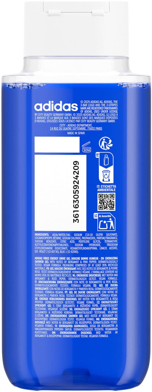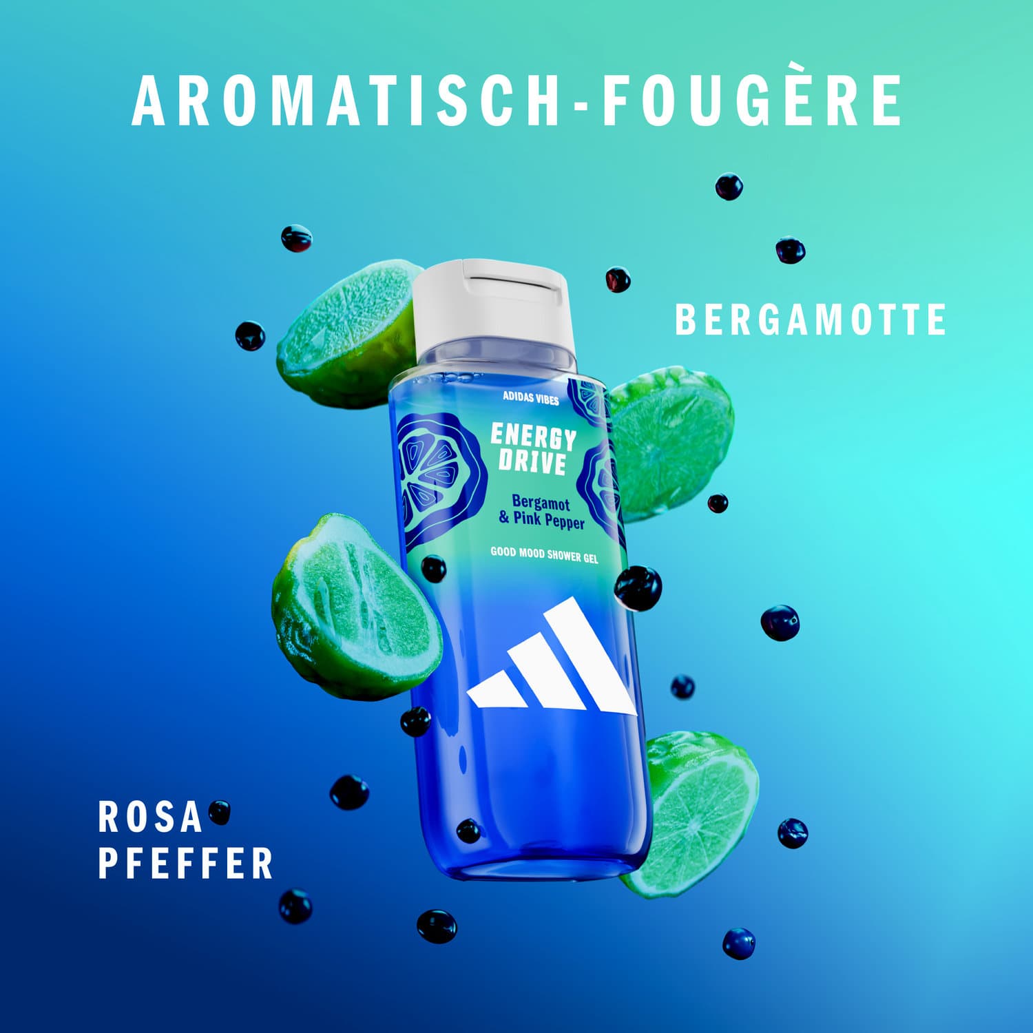 Spüre den Vibe mit dem neuen adidas Vibes Energy Drive Duschgel. Dieses Good Mood Duschgel verströmt einen belebenden Duft von Bergamotte und rosa Pfeffer. Die vegane Formulierung des Duschgels ist dermatologisch getestet und eignet sich für empfindliche Haut sowie zur täglichen Anwendung.