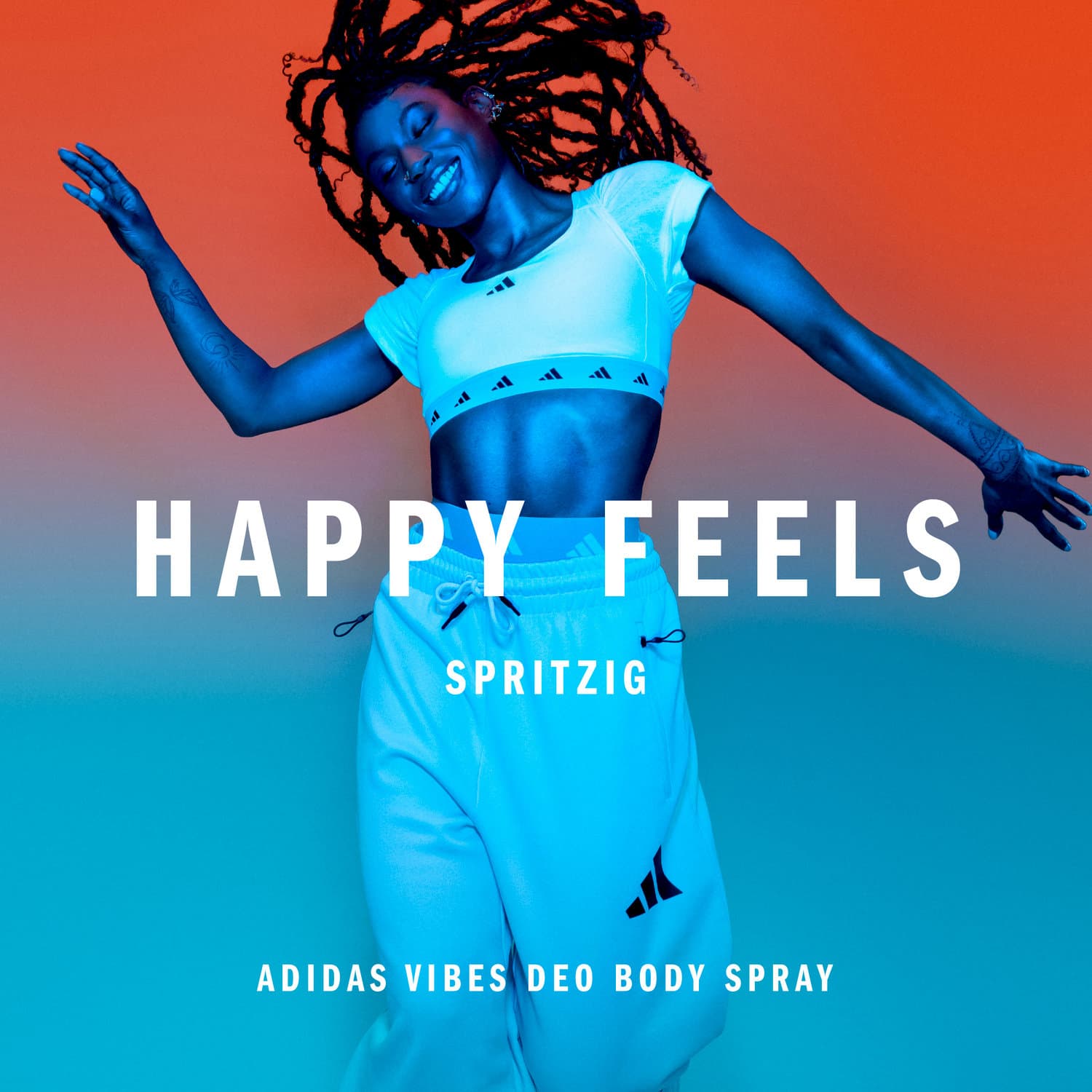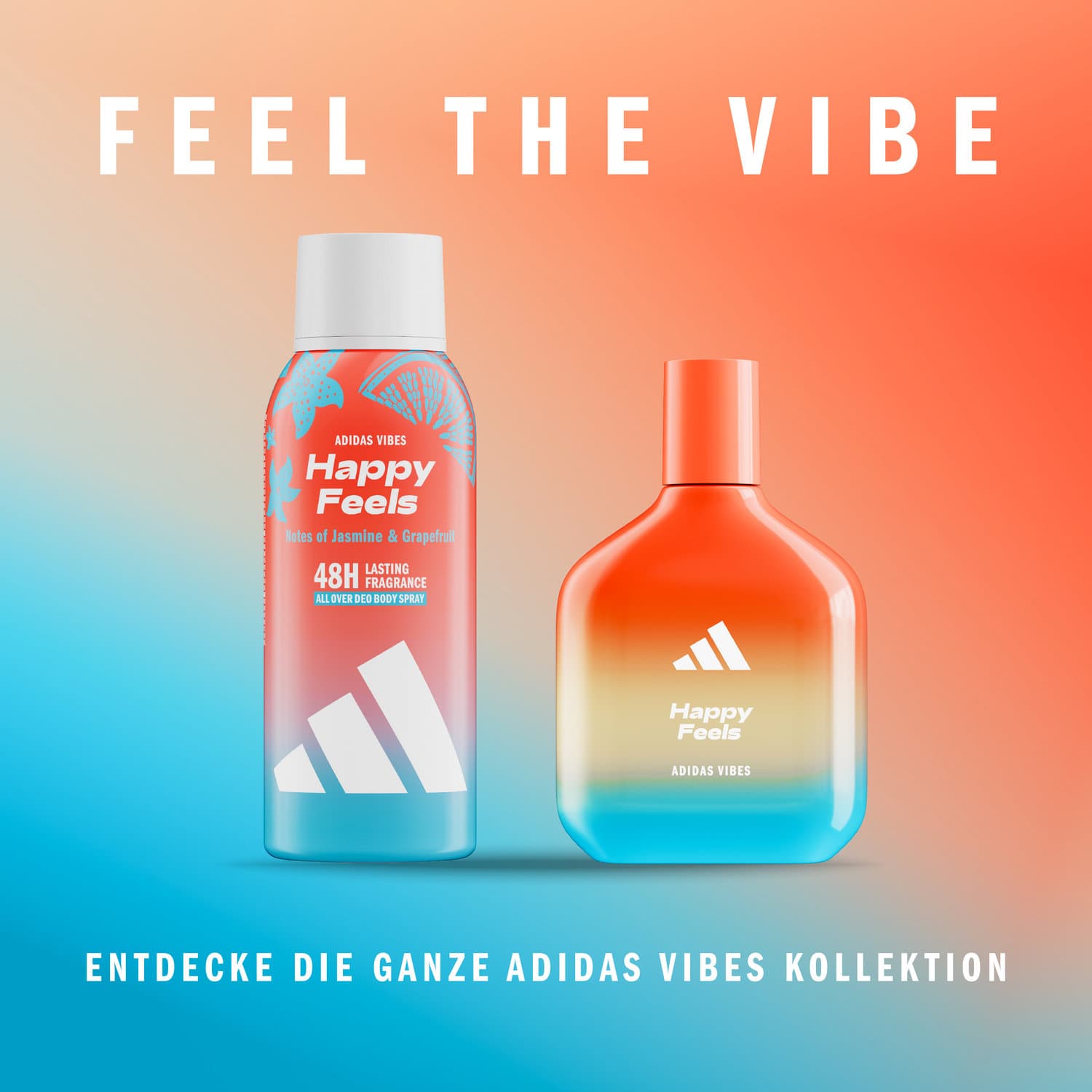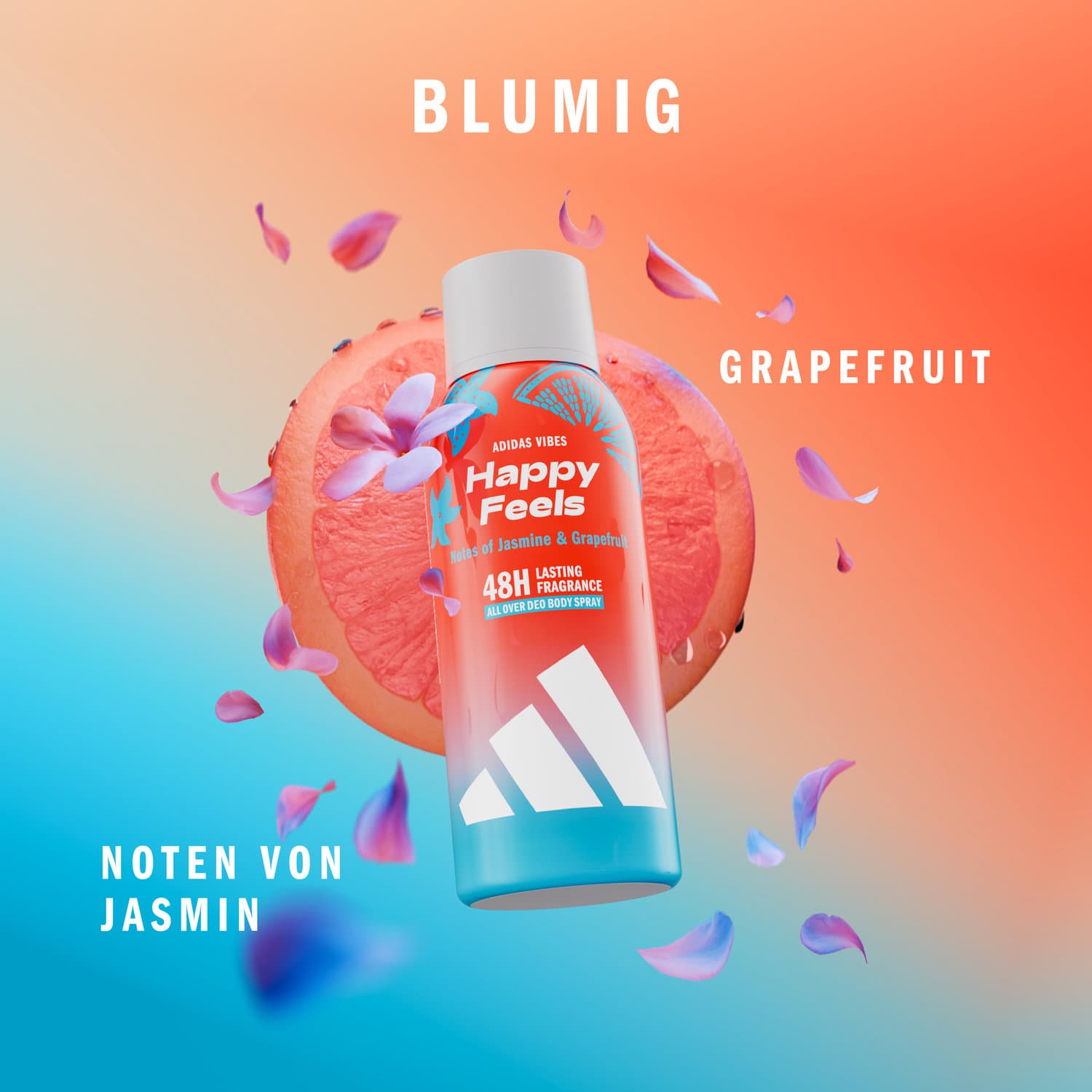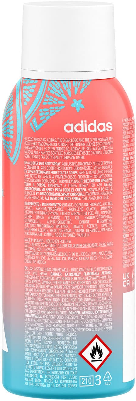 Spüre den Vibe und fühle dich schwerelos mit dem adidas Vibes Happy Feels All Over Deo Body Spray. Dieses Deo wurde mit einem Duft entwickelt, der nachweislich positive Gefühle auslöst.* Es verströmt Noten von Jasmin und Grapefruit und hält 48 Stunden lang an. Das dermatologisch getestete Deo Body Spray bietet Geruchsschutz und ist für empfindliche Haut geeignet. *84% Zustimmung in einem Verbrauchertest mit 117 Teilnehmenden.