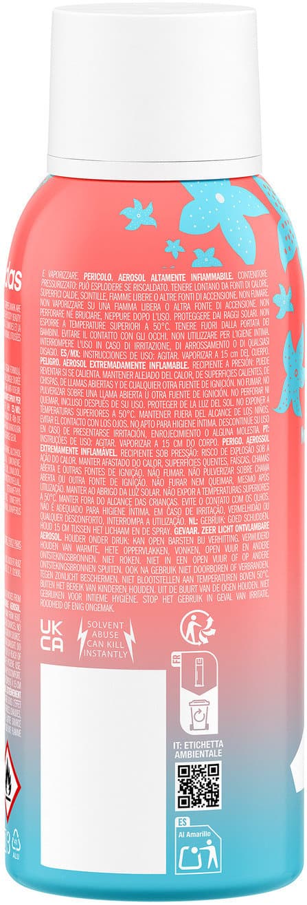 | Inhaltsstoffe | Butane-Isobutane-Propane, Alcohol Denat., Parfum/Fragrance, Propylene Glycol, Limonene, Hexamethylindanopyran, Citrus Aurantium Peel Oil, Linalool, Citrus Limon (Lemon) Peel Oil, Hydroxycitronellal, Citronellol, Alpha-Isomethyl Ionone, Tetramethyl Acetyloctahydronaphthalenes, Linalyl Acetate, Dimethyl Phenethyl Acetate, Hexyl Cinnamal, Pinene, Geraniol, Juniperus Virginiana Oil, Citral, Rose Ketones, Vanillin. |