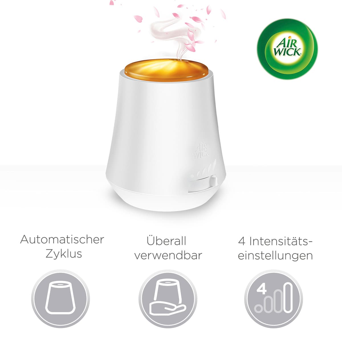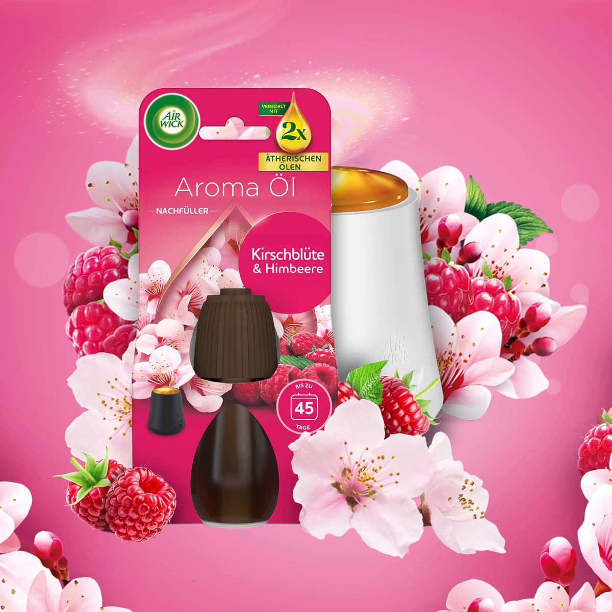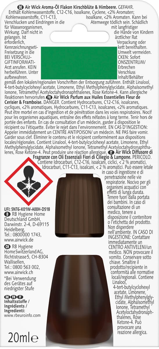 Air Wick Aroma-Öl Flakon Kirschblüte & Himbeere - Lassen Sie sich verzaubern von dem aromatischen Duft von Kirschblüten, roten Früchten und einen Hauch von Sandelholz in jedes Zuhause. Der elegante Air Wick Aroma-Öl Diffuser sorgt für ein noch nie dagewesenes Dufterlebnis. Der batteriebetriebene Diffuser verwandelt 2x ätherische Öle automatisch in einen angenehmen, feinen Duftnebel. Zeitintervalle und Duftintensität lassen sich dabei individuell regulieren. Das Gerät verfügt außerdem über einen Stand-by-Modus - nach 8 Stunden Laufzeit schaltet sich das Gerät für 16 Stunden in den Stand-by-Modus und startet danach automatisch wieder von vorne. Die Aroma-Öl Flakons sind in verschiedenen Düften erhältlich und bieten bis zu 45 Tage lang ein authentisches, hochwertiges Dufterlebnis. Vor Gebrauch stets Kennzeichnung und Produktinformation lesen. www.rbeuroinfo.com