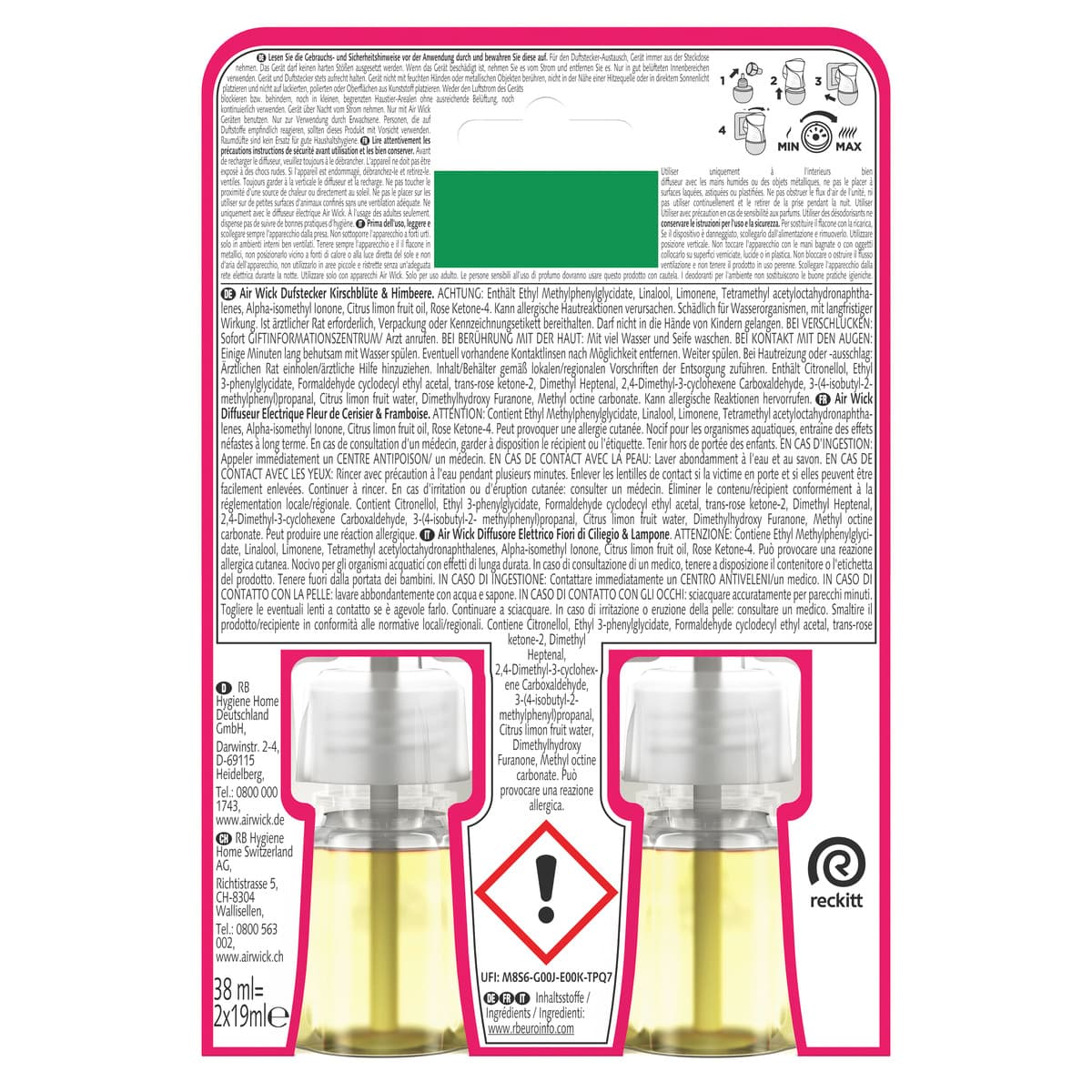 Air Wick Duftstecker Nachfüller DUO Kirschblüte & Himbeere - Ein floraler Duft, inspiriert von Kirschblüten und roten Früchten, wird in Ihr Zuhause gebracht und mit einer Note von Sandelholz verfeinert. Ein kontinuierliches Dufterlebnis wird für die Steckdose bereitgestellt, das bis zu 120 Tage lang anhaltenden Duft pro Nachfüller bietet. Hochwertige Düfte mit 2x ätherischen Ölen werden verwendet, um eine natürliche und angenehme Duftverteilung zu gewährleisten. Eine ideale Duftverteilung in jede Ecke des Raumes wird durch das Gerät ermöglicht, wobei die Duftintensität in 5 Stufen angepasst werden kann. Vor Gebrauch stets Kennzeichnung und Produktinformation lesen.
