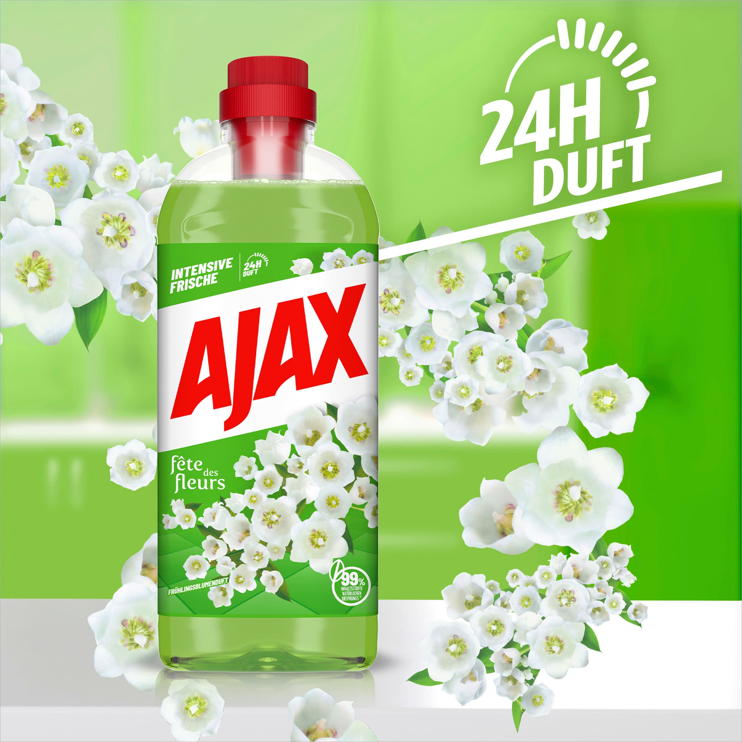 Lassen Sie ihr Zuhause glänzen und duften mit dem Ajax Fête des Fleurs Frühlingsblumen Allzweckreiniger. Dieser Multi-Oberflächen-Reiniger wurde mit ätherischen Ölen angereichert und sorgt 24h lang für natürliche Frische. Der Ajax Allzweckreiniger hat eine neue Formel, die für Ihr Zuhause wirksamer ist und schont selbst empfindliche Oberflächen wie Marmor oder Keramik. Der Ajax Frühlingsblumen Allzweckreiniger kommt in einer neuen Flasche, die aus recyceltem Plastik hergestellt ist. Flasche und Verschluss sind recycelbar und die Formel ist zu 96% biologisch abbaubar. Sie können sich sicher sein, dass Ajax rücksichtsvoller mit unserem Planeten ist und sich mit Ihnen weiterentwickelt, wenn Sie sich um die kleinen Verschmutzungen des Lebens kümmern.