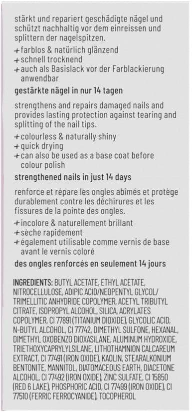 Die spezielle Zusammensetzung mit Inhaltsstoffen wie Glycolsäure und Hexanal trägt dazu bei, die Nagelstruktur zu festigen. Bei regelmäßiger Anwendung über einen Zeitraum von zwei Wochen kann die Nagelqualität positiv beeinflusst werden. Das Ergebnis sind Nägel, die gefestigter erscheinen und durch den Lack ein gepflegtes Aussehen mit dezentem Glanz erhalten.