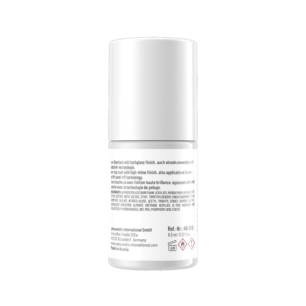 Dank Abzieh-Technologie ist auch der UV Nagellack Top Coat einzeln wie eine Farbe anwendbar. Den Nagel wie gewohnt vorbereiten, Top Coat auftragen, aushärten und Schwitzschicht mit Prep & Shine Pad entfernen.