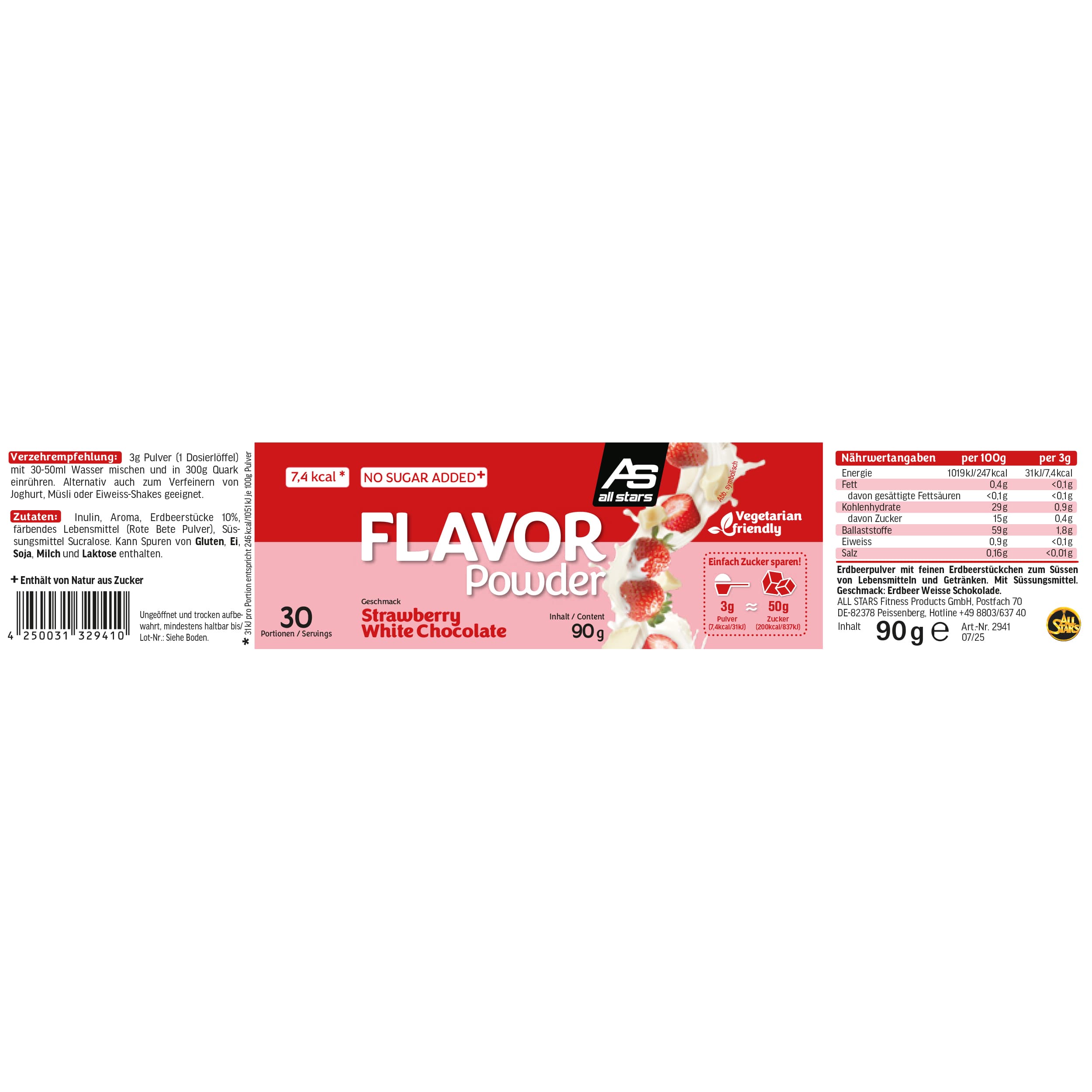Nahrungsergänzungsmittel: Kalorienarm und praktisch, Das All Stars Flavour Powder zur geschmacklichen Verfeinerung von Joghurt, Quark, Müsli, Protein Shaker und Smoothies. Je 3g Pulver (1 Dosierlöffel) sind maximal 0, 2g Fett und höchstens 0, 4g Zucker enthalten. Das Flavour Powder ist mit Sucralose gesüßt und enthält kein Aspartam. Zusätzlich zum Süßstoff wird auf herkömmlichen Zucker verzichtet. Leckere Schokoladen Stücke (Chunks) bzw. Getrocknete Erdbeerstücke sorgen für ein besonderes Geschmackserlebnis. Aufgrund der minimalen Zucker- und fettmengen liefert eine Portion Flavour Powder weniger als 10 Kalorien.