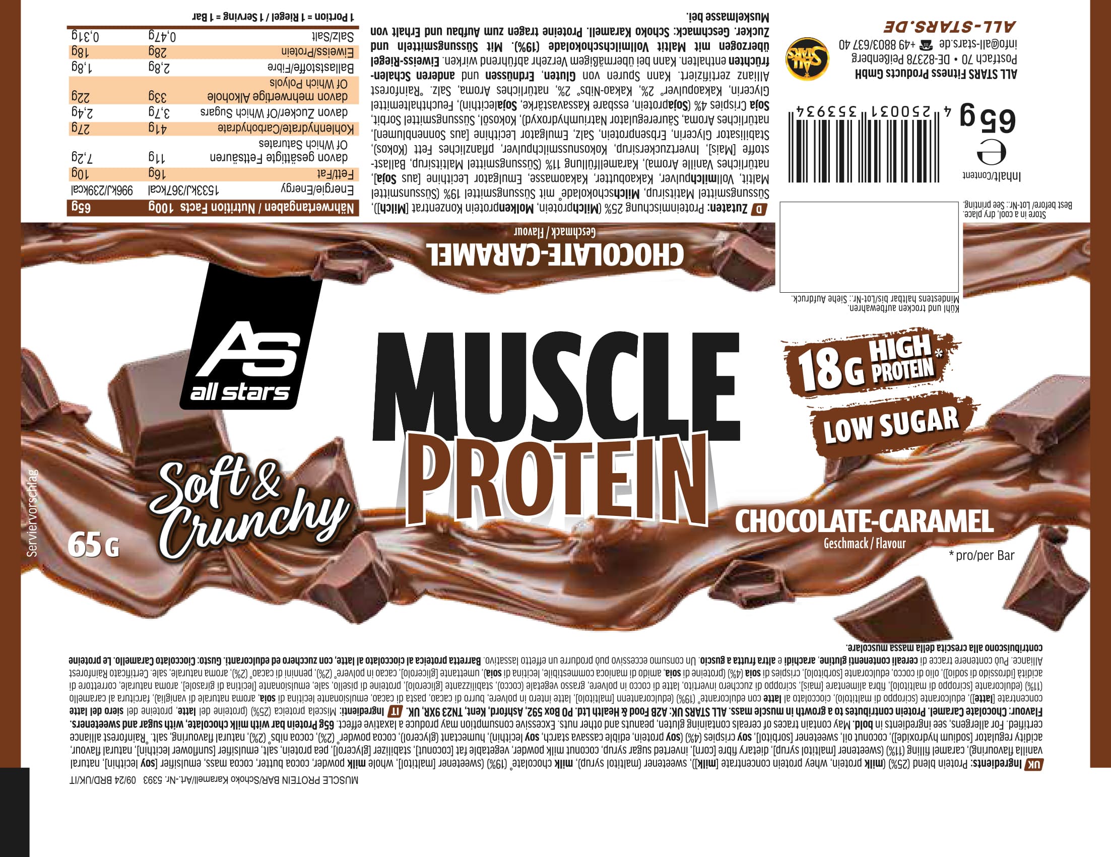 Nahrungsergänzungsmittel: Der neue Protein Riegel von ALL STARS ist soft & crunchy zugleich. Je Portion (65g) ist wenig Zucker, dafür mit 18g fast 30% Eiweiß enthalten. Die Proteinmischung ist zusammengestellt aus hochwertigem Milchprotein und Molkenprotein-Konzentrat. Der Cruncheffekt wird durch leckeren Crispies erreicht und die Riegel sind mit einem zarten Milchschokoladenüberzug umhüllt. Es wird Kokosfett für den Riegel genutzt, kein Palmfett, und es ist kein zusätzlicher Zucker zu den natürlich enthaltenen Anteilen zugefügt. Ideal für alle gesundheitsbewussten Genießer als zusätzlicher Eiweißlieferant in Muskelaufbauphasen, zur Unterstützung beim Muskelerhalt oder einfach als proteinreicher Süßigkeitenersatz.