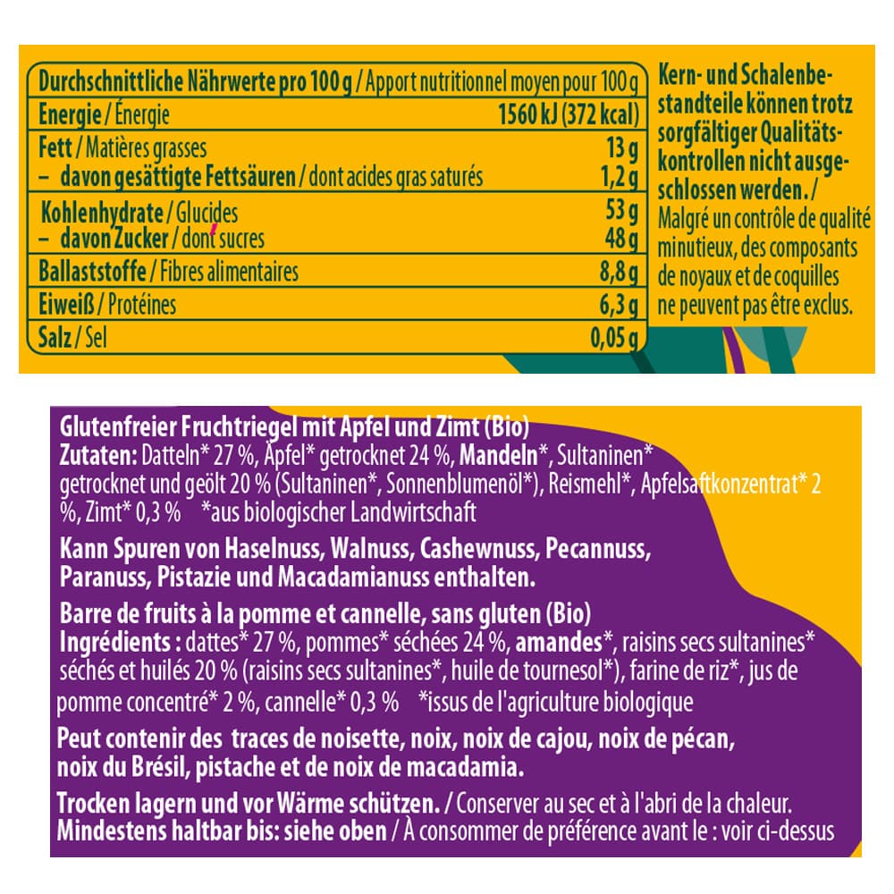 | Zutaten | Datteln* 27 %, Äpfel* getrocknet 24 %, MANDELN*, Sultaninen* getrocknet und geölt 20 % (Sultaninen*, Sonnenblumenöl*), Reismehl*, Apfelsaftkonzentrat* 2 %, Zimt* 0,3 % *aus biologischer Landwirtschaft Kann Spuren von Haselnuss, Walnuss, Cashewnuss, Pecannuss, Paranuss, Pistazie und Macadamianuss enthalten |