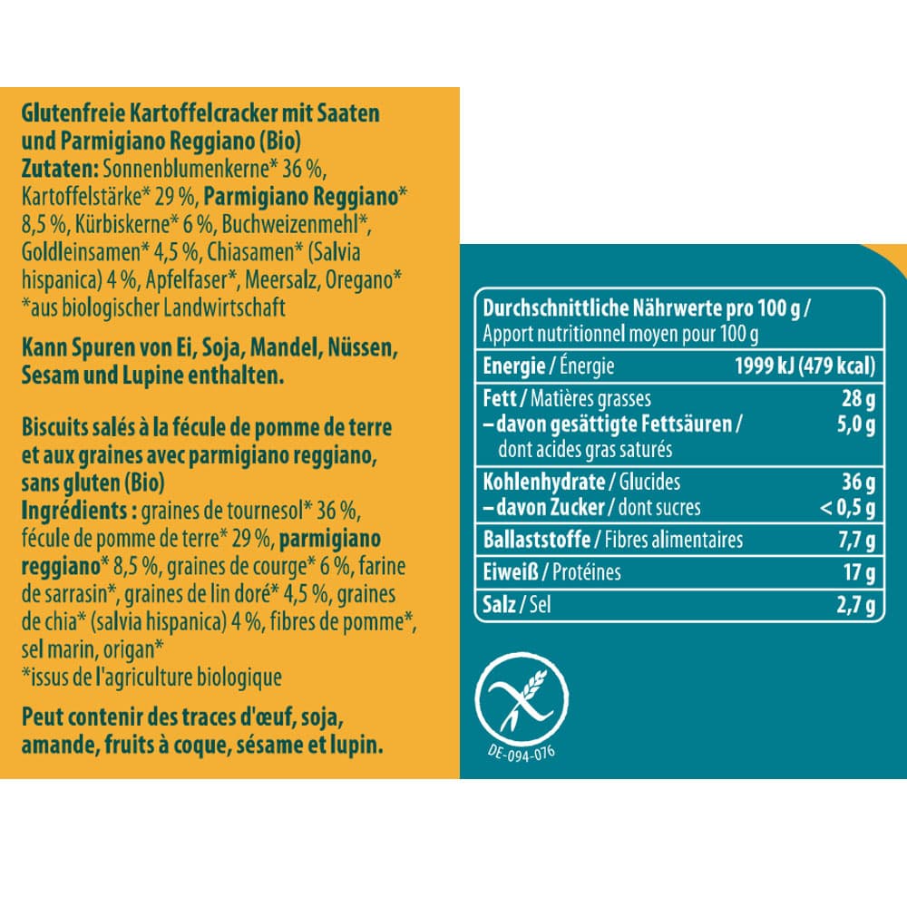 Zutaten Sonnenblumenkerne* 36 %, Kartoffelstärke* 29 %, PARMIGIANO REGGIANO* 8,5 %, Kürbiskerne* 6 %, Buchweizenmehl*, Leinsamen* 4,5 %, Chiasamen* (Salvia hispanica) 4 %, Apfelfaser*, Meersalz, Oregano* *aus biologischer Landwirtschaft. Kann Spuren von Ei, Soja, Mandel, Nüssen, Sesam und Lupine enthalten