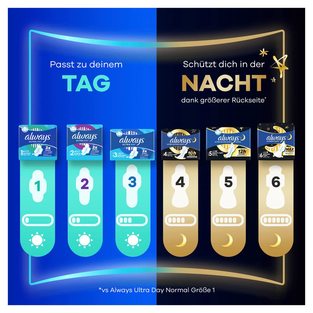 Gib dich nicht mit weniger als dem 3-fachen Schutz der Always Ultra Day Long (Größe 2) Damenbinden mit Flügeln zufrieden. Always Binden mit saugfähiger und weicher Oberfläche absorbieren Periodenblut dank der InstantDry-Technologie in Sekundenschnelle und verhindern dank der LeakGuard- und OdourLock-Technologien das Auslaufen von Flüssigkeit und neutralisieren Gerüche. Ihre einzigartigen ComfortLock-Flügel passen sich jeder Art von Unterwäsche an. Für zusätzlichen Schutz in der Nacht empfehlen wir die Always Ultra Nacht Größen. Always Ultra Binden sind von der Skin Health Alliance dermatologisch bestätigt.