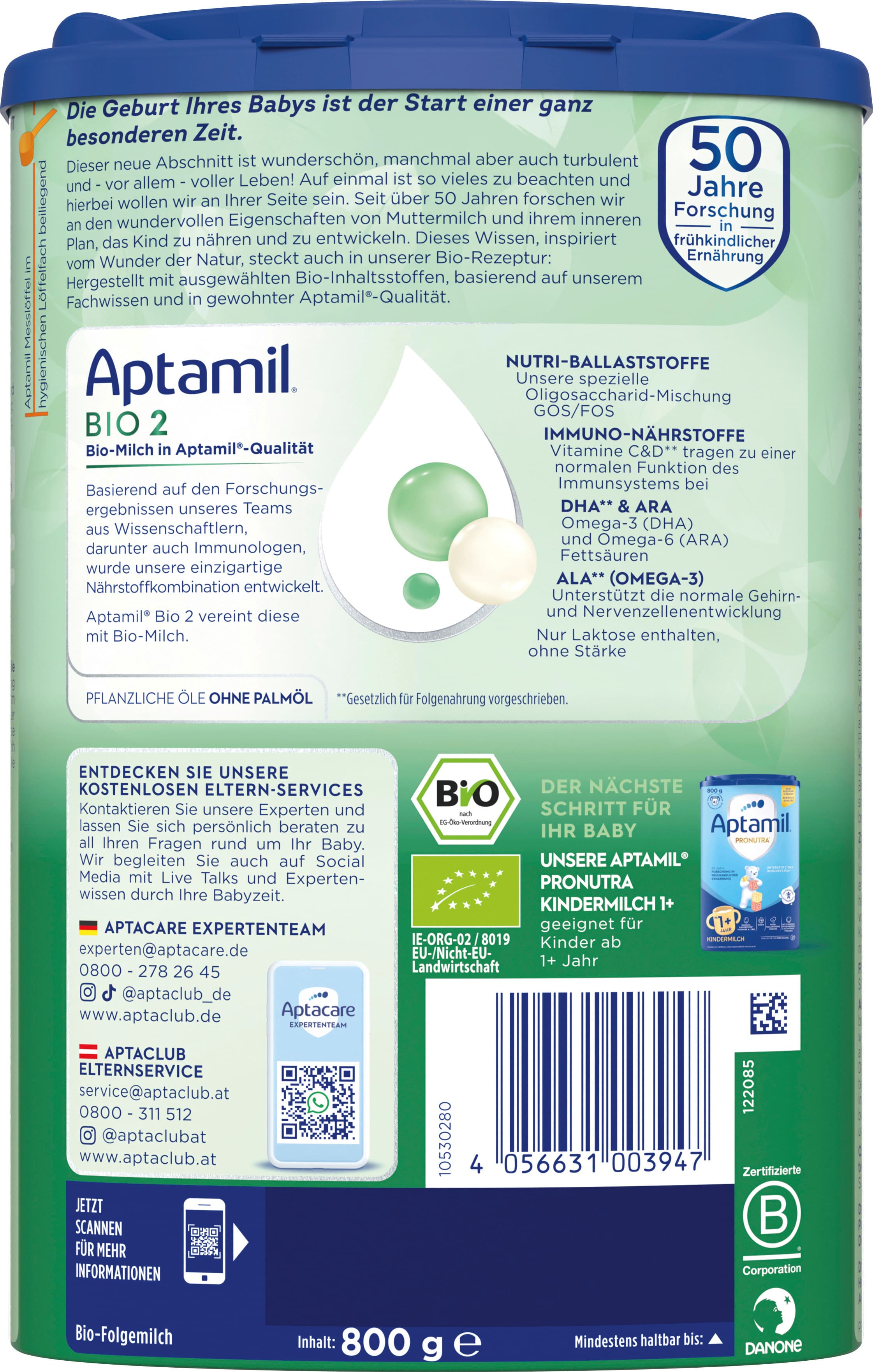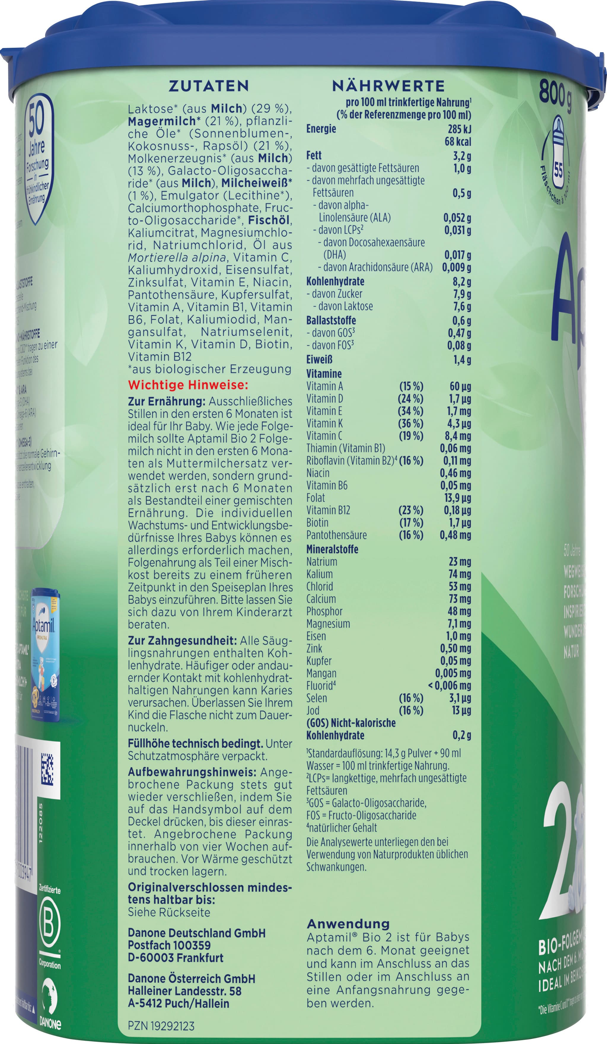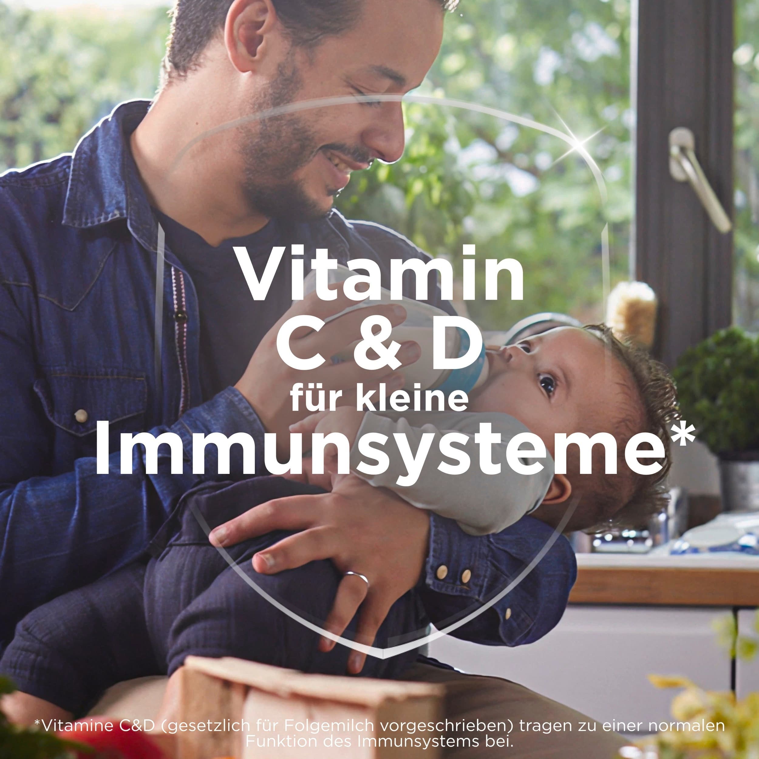 | Zutaten | Laktose* (aus MILCH) (29 %), MAGERMILCH* (21 %), pflanzliche Öle* (Sonnenblumen-, Kokosnuss-, Rapsöl) (21 %), Molkenerzeugnis* (aus MILCH) (13 %), Galacto-Oligosaccharide* (aus MILCH), MILCHEIWEIß* (1 %), Emulgator (Lecithine*), Calciumorthophosphate, Fructo-Oligosaccharide*, FISCHÖL, Kaliumcitrat, Magnesiumchlorid, Natriumchlorid, Öl aus Mortierella alpina, Vitamin C, Kaliumhydroxid, Eisensulfat, Zinksulfat, Vitamin E, Niacin, Pantothensäure, Kupfersulfat, Vitamin A, Vitamin B1, Vitamin B6, Folat, Kaliumiodid, Mangansulfat, Natriumselenit, Vitamin K, Vitamin D, Biotin, Vitamin B12 *aus biologischer Erzeugung |