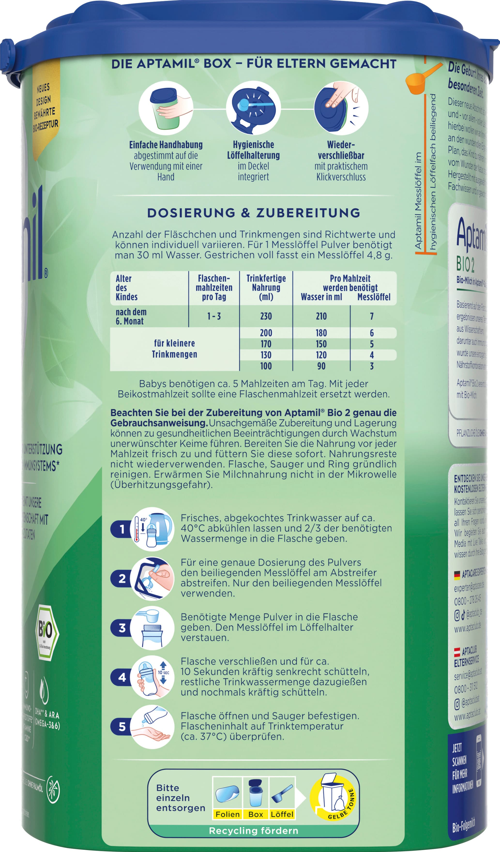 | Zubereitungshinweis | Beachten Sie bei der Zubereitung von Aptamil® BIO 2 genau die Gebrauchsanweisung. Unsachgemäße Zubereitung und Lagerung können zu gesundheitlichen Beeinträchtigungen durch Wachstum unerwünschter Keime führen. Bereiten Sie die Nahrung vor jeder Mahlzeit frisch zu und füttern Sie diese sofort. Nahrungsreste nicht wiederverwenden. Flasche, Sauger und Ring gründlich reinigen. Erwärmen Sie Milchnahrung nicht in der Mikrowelle (Überhitzungsgefahr). 1 Frisches, abgekochtes Trinkwasser auf ca. 40°C abkühlen lassen und 2/3 der benötigten Wassermenge in die Flasche geben. 2 Für eine genaue Dosierung des Pulvers den beiliegenden Messlöffel am Abstreifer abstreifen. Nur den beiliegenden Messlöffel verwenden. 3 Benötigte Menge Pulver in die Flasche geben. Den Messlöffel im Löffelhalter verstauen. 4 Flasche verschließen und für ca. 10 Sekunden kräftig senkrecht schütteln, restliche Trinkwassermenge dazugießen und nochmals kräftig schütteln. 5 Flasche öffnen und Sauger befestigen. Flascheninhalt auf |