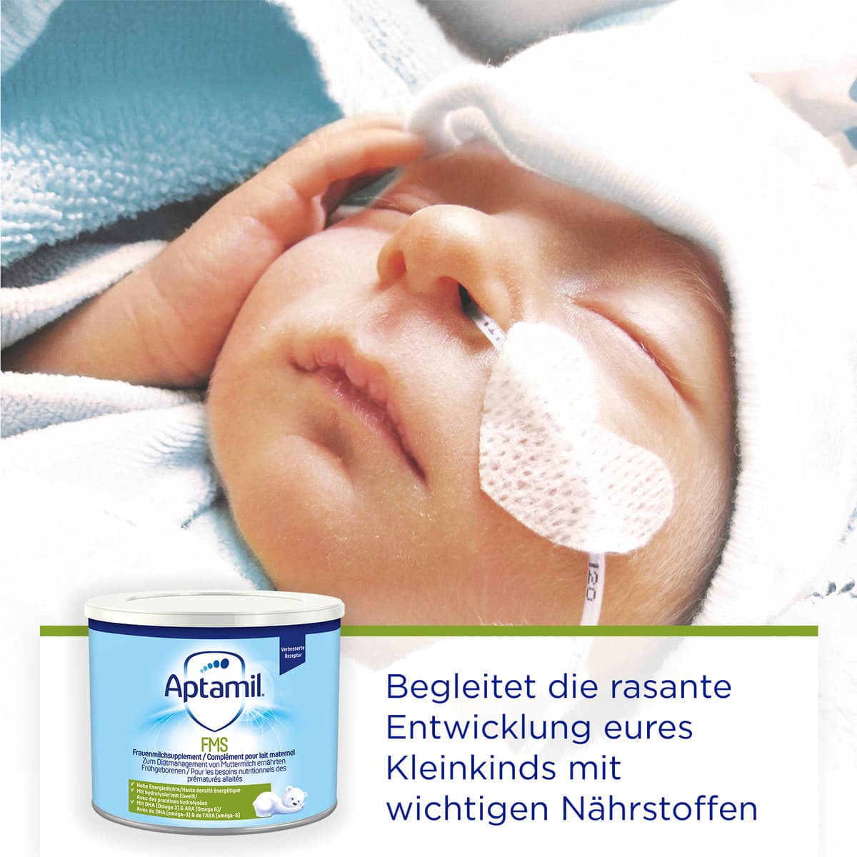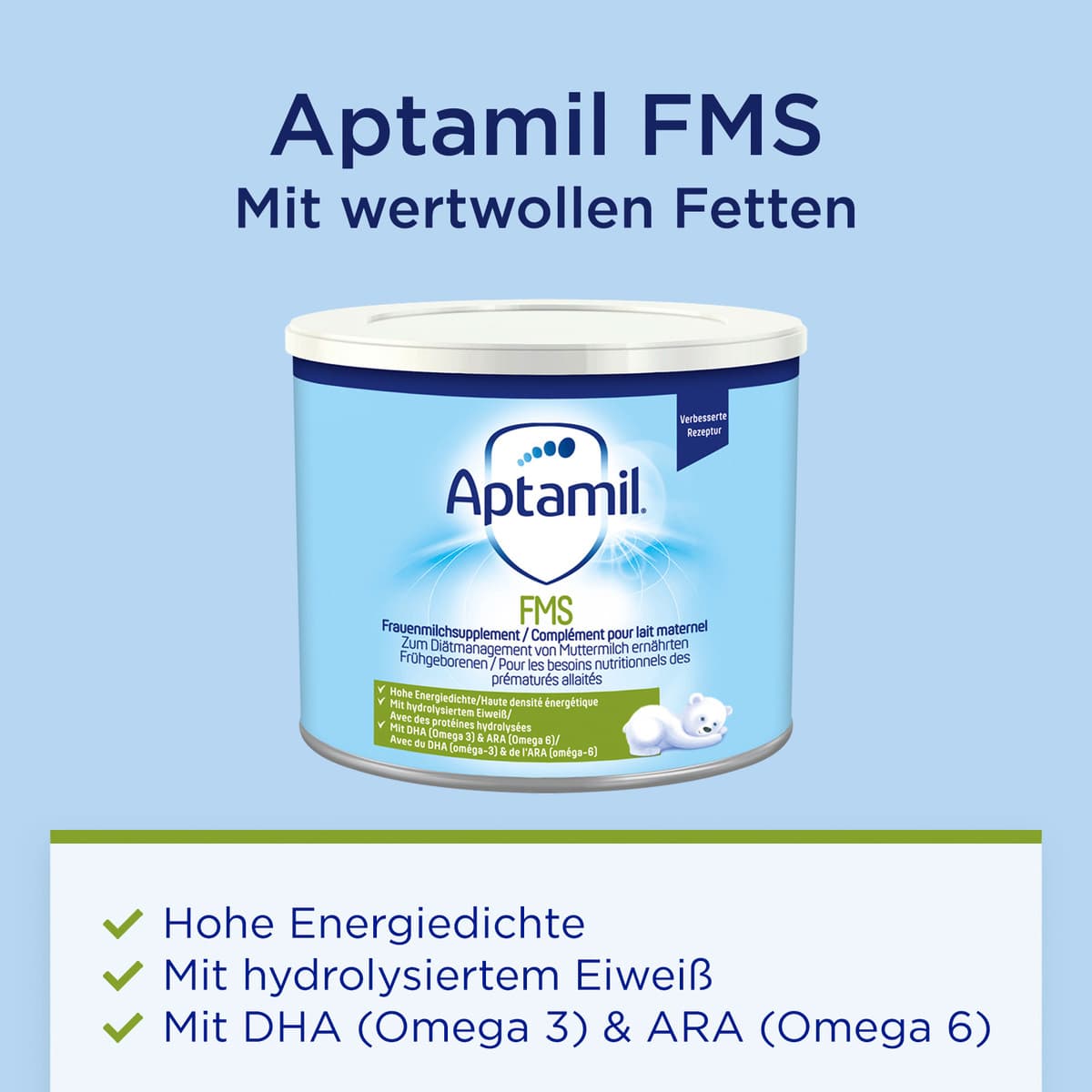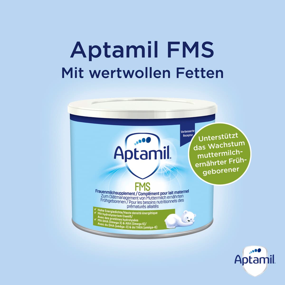 Unser Frauenmilchsupplement für mit Muttermilch ernährte Frühgeborene und untergewichtige Neugeborene. Durch den Zusatz von Aptamil FMS wird die natürliche Zusammensetzung von Frauenmilch dem besonderen Nährstoffbedarf von Frühgeborenen und untergewichtigen Neugeborenen angepasst. Aptamil FMS reichert Frauenmilch bedarfsgerecht mit hydrolysiertem Eiweiß, Kohlenhydraten, Fetten, Mineralstoffen, Spurenelementen und Vitaminen an.
