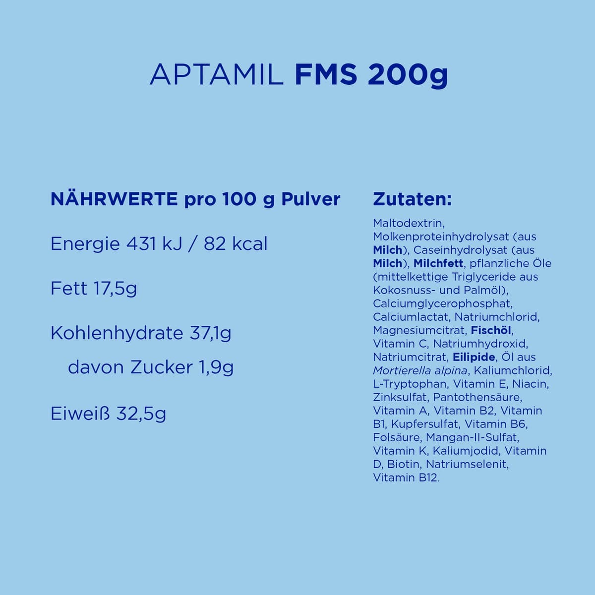 | Anwendungshinweis | Beachten Sie bei der Zubereitung von Aptamil FMS genau die Gebrauchsanweisung. Unsachgemäße Zubereitung und Lagerung kann zu gesundheitlichen Beeinträchtigungen durch Wachstum unerwünschter Keime führen. Bereiten Sie die Nahrung vor jeder Mahlzeit frisch zu und füttern Sie diese sofort. Nahrungsreste nicht wiederverwenden. Flasche, Sauger und Ring gründlich reinigen. Erwärmen Sie Milchnahrung nicht in der Mikrowelle (Überhitzungsgefahr). |