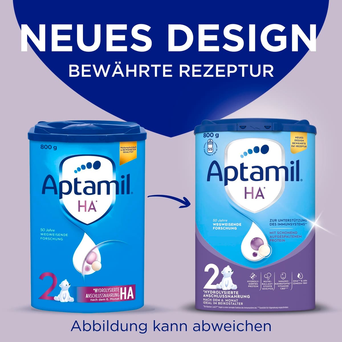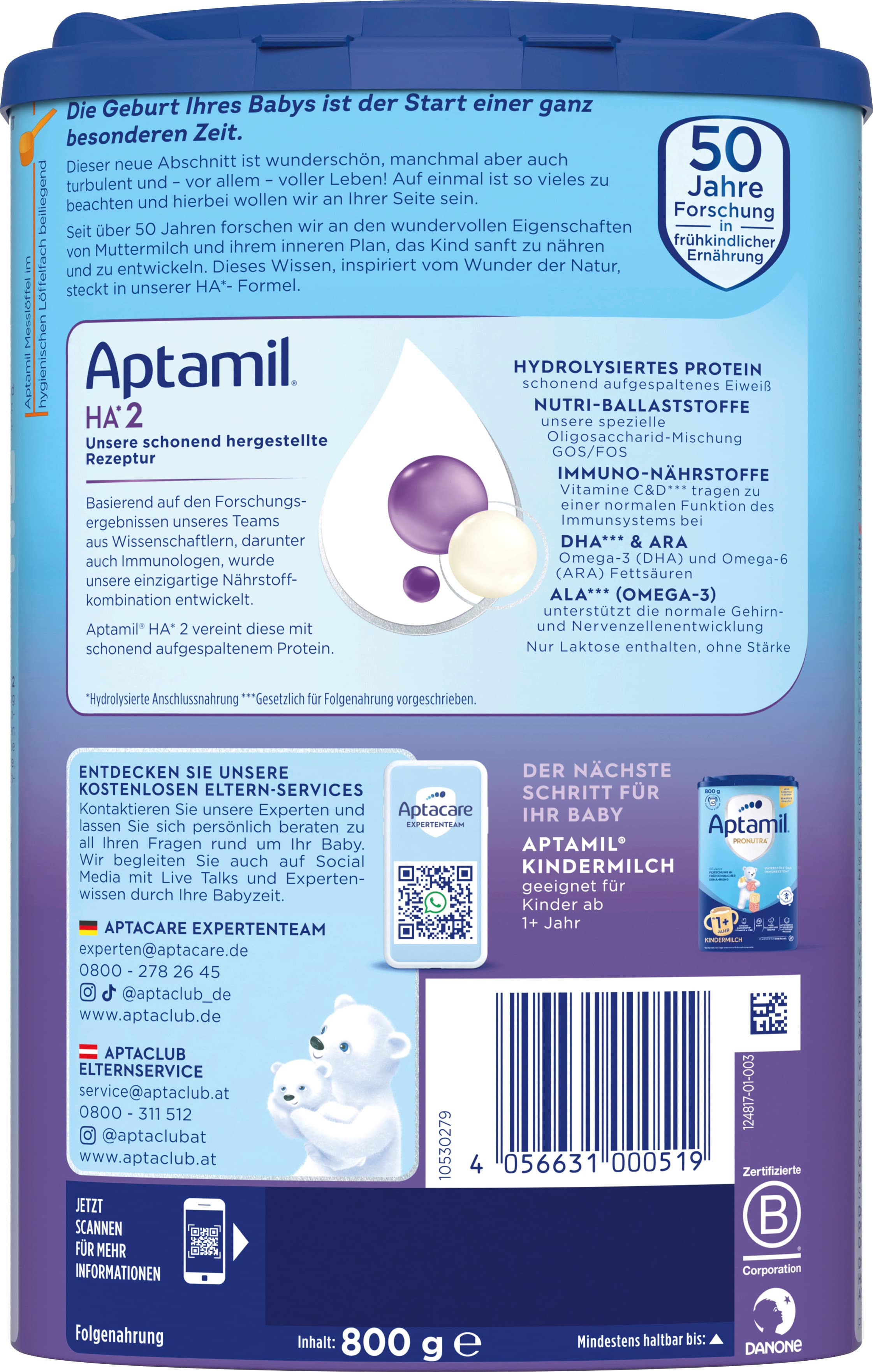 | Anwendungshinweis | Aptamil HA 2 ist für Babys nach dem 6. Monat geeignet und kann im Anschluss an das Stillen oder im Anschluss an eine Anfangsnahrung gegeben werden. |