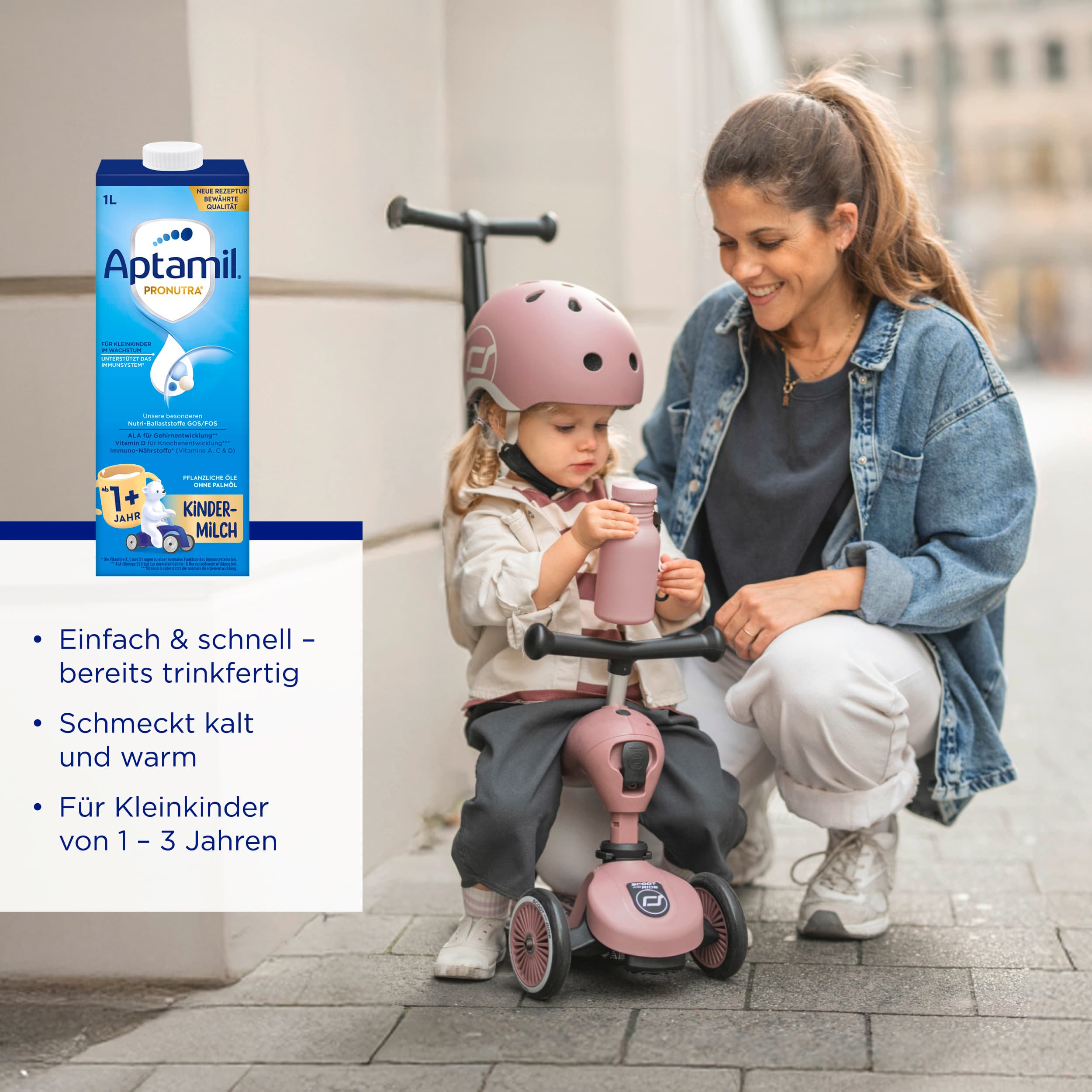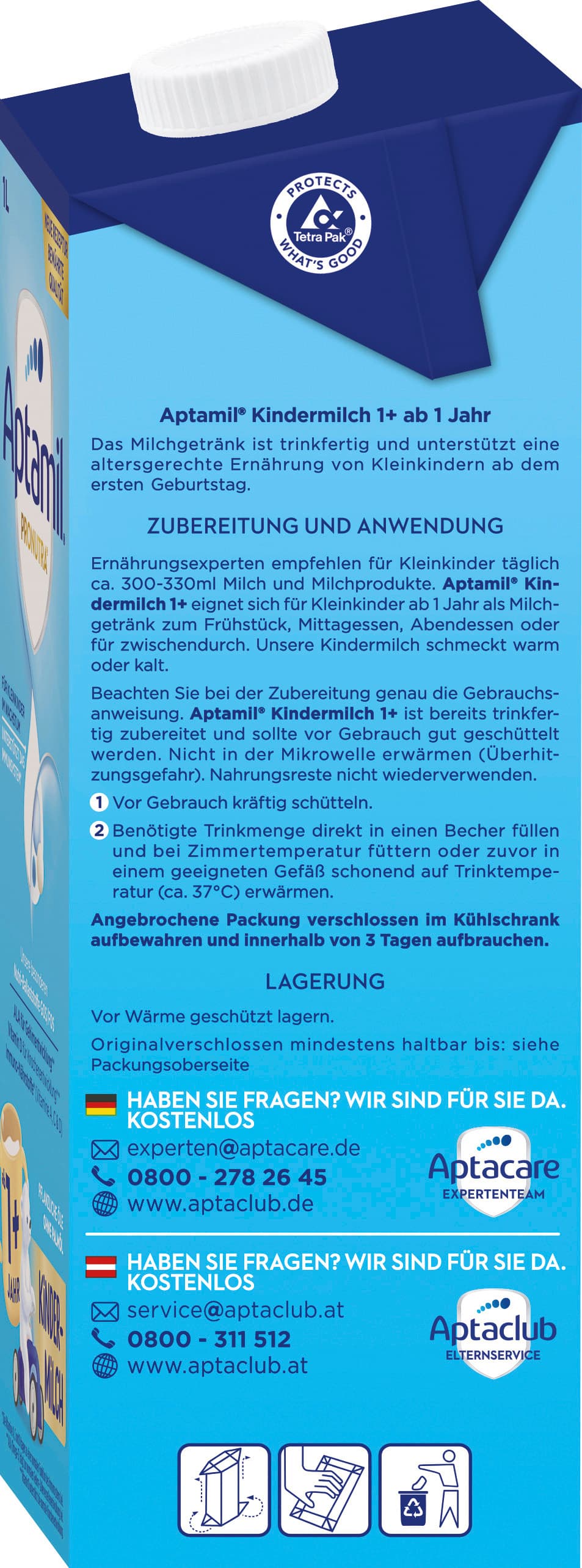 | Zubereitungshinweis | Zubereitung und Anwendung Ernährungsexperten empfehlen für Kleinkinder täglich ca. 300-330ml Milch und Milchprodukte. Aptamil Kindermilch 1+ eignet sich für Kleinkinder ab 1 Jahr als Milchgetränk zum Frühstück, Mittagessen, Abendessen oder für zwischendurch. Unsere Kindermilch schmeckt warm oder kalt. Beachten Sie bei der Zubereitung genau die Gebrauchsanweisung. Aptamil Kindermilch 1+ ist bereits trinkfertig zubereitet und sollte vor Gebrauch gut geschüttelt werden. Nicht in der Mikrowelle erwärmen (Überhitzungsgefahr). Nahrungsreste nicht wiederverwenden. 1. Vor Gebrauch kräftig schütteln. 2. Benötigte Trinkmenge direkt in einen Becher füllen und bei Zimmertemperatur füttern oder zuvor in einem geeigneten Gefäß schonend auf Trinktemperatur (ca. 37°C) erwärmen. Angebrochene Packung verschlossen im Kühlschrank aufbewahren und innerhalb von 3 Tagen aufbrauchen. |