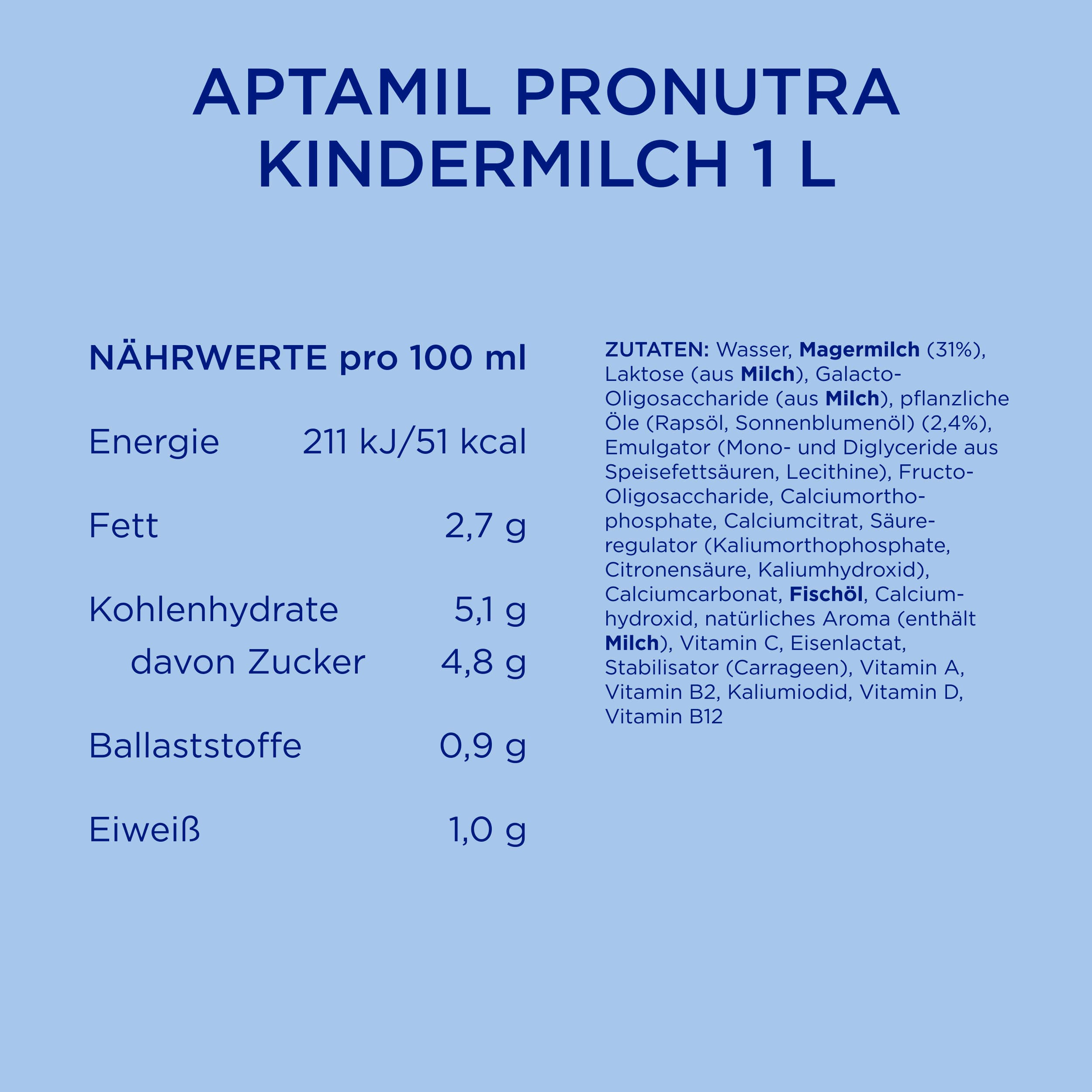 | Zutaten | MAGERMILCH (59%), Wasser, Galacto-Oligosaccharide (aus MILCH), Laktose (aus MILCH), pflanzliche Öle (Rapsöl, Sonnenblumenöl) (2%), Säureregulatoren (Kaliumcitrat, Citronensäure, Kaliumorthophosphate, Kaliumhydroxid), Fructo-Oligosaccharide, Emulgator (Mono- und Diglyceride aus Speisefettsäuren), Calciumorthophosphate, Calciumcitrat, Calciumhydroxid, Milcharoma (enthält MILCH), Vitamin C, Eisenlactat, Zinksulfat, Vitamin B2, Vitamin A, Kaliumiodid, Vitamin D, Vitamin B12 |
