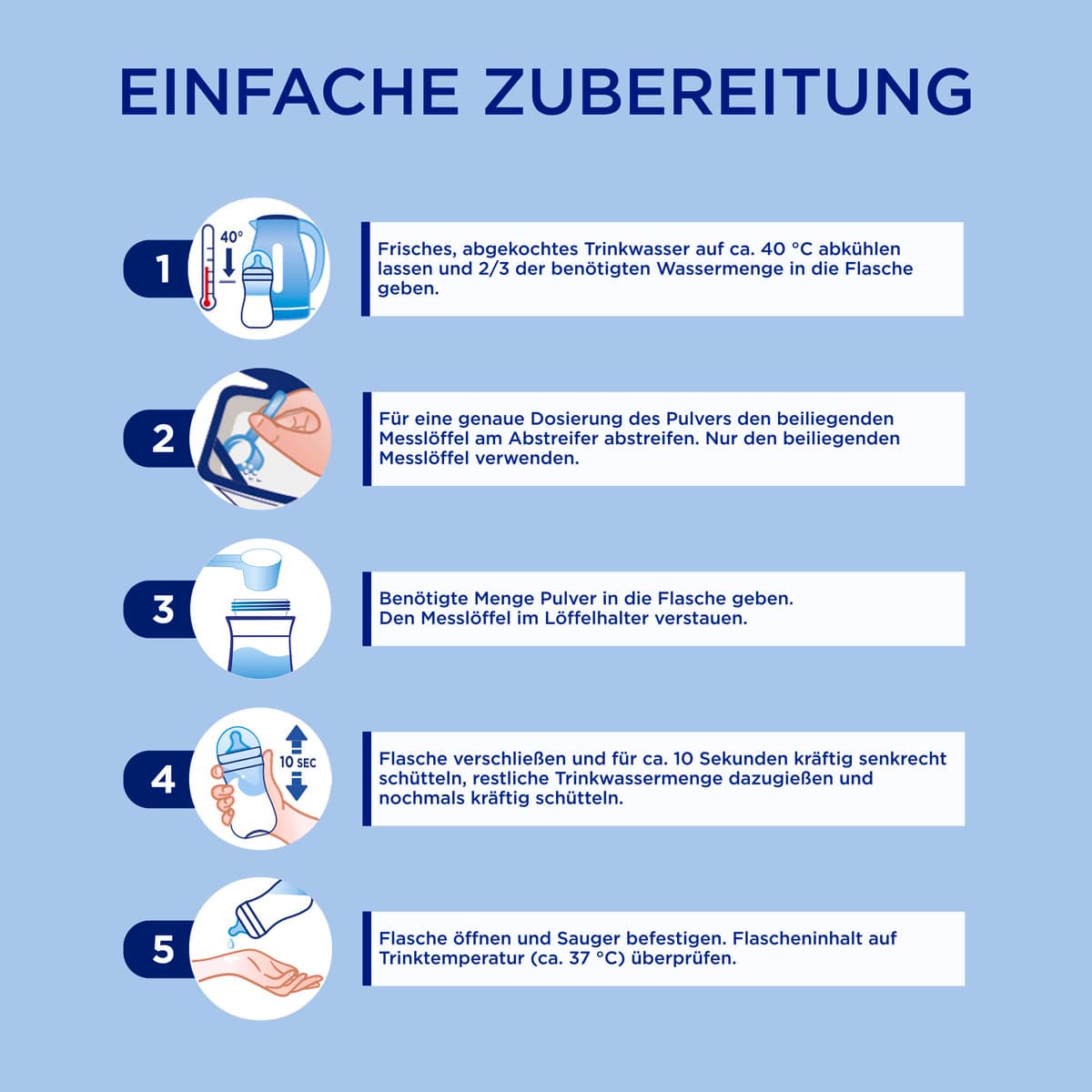 | Zubereitungshinweis | Zubereitung Beachten Sie bei der Zubereitung von Aptamil® Pronutra 2 genau die Gebrauchsanweisung. Unsachgemäße Zubereitung und Lagerung können zu gesundheitlichen Beeinträchtigungen durch Wachstum unerwünschter Keime führen. Bereiten Sie die Nahrung vor jeder Mahlzeit frisch zu und füttern Sie diese sofort. Nahrungsreste nicht wiederverwenden. Flasche, Sauger und Ring gründlich reinigen. Erwärmen Sie Milchnahrung nicht in der Mikrowelle (Überhitzungsgefahr). 1. Frisches, abgekochtes Trinkwasser auf ca. 40°C abkühlen lassen und 2/3 der benötigten Wassermenge in die Flasche geben. 2. Für eine genaue Dosierung des Pulvers den beiliegenden Messlöffel mit einem Messerrücken abstreifen. Nur den beiliegenden Messlöffel verwenden. 3. Benötigte Menge Pulver in die Flasche geben. 4. Flasche verschließen und für ca. 10 Sekunden kräftig senkrecht schütteln, restliche Trinkwassermenge dazugießen und nochmals kräftig schütteln. 5. Flasche öffnen und Sauger befestigen. Flascheninhalt auf Trinkt |
