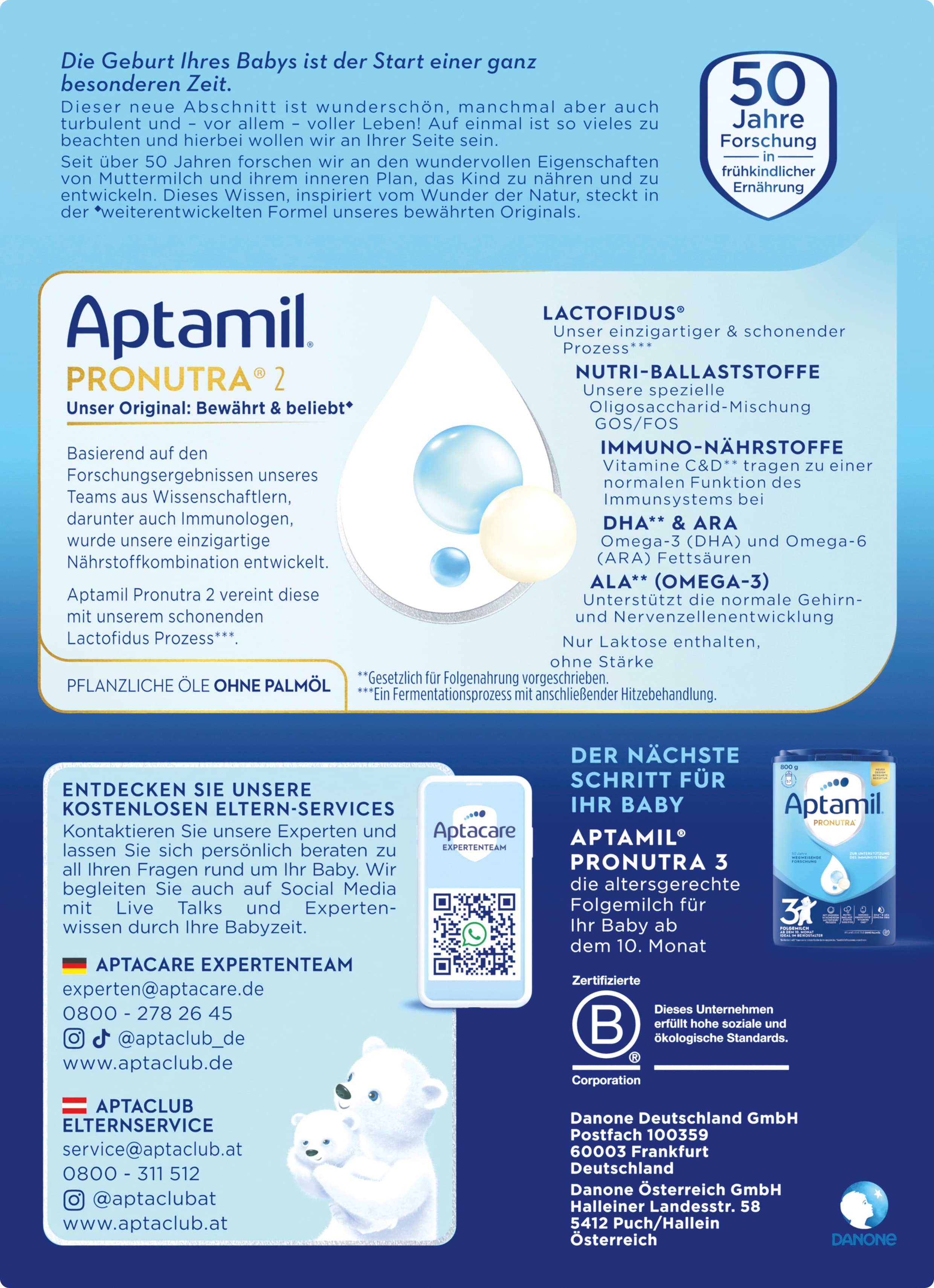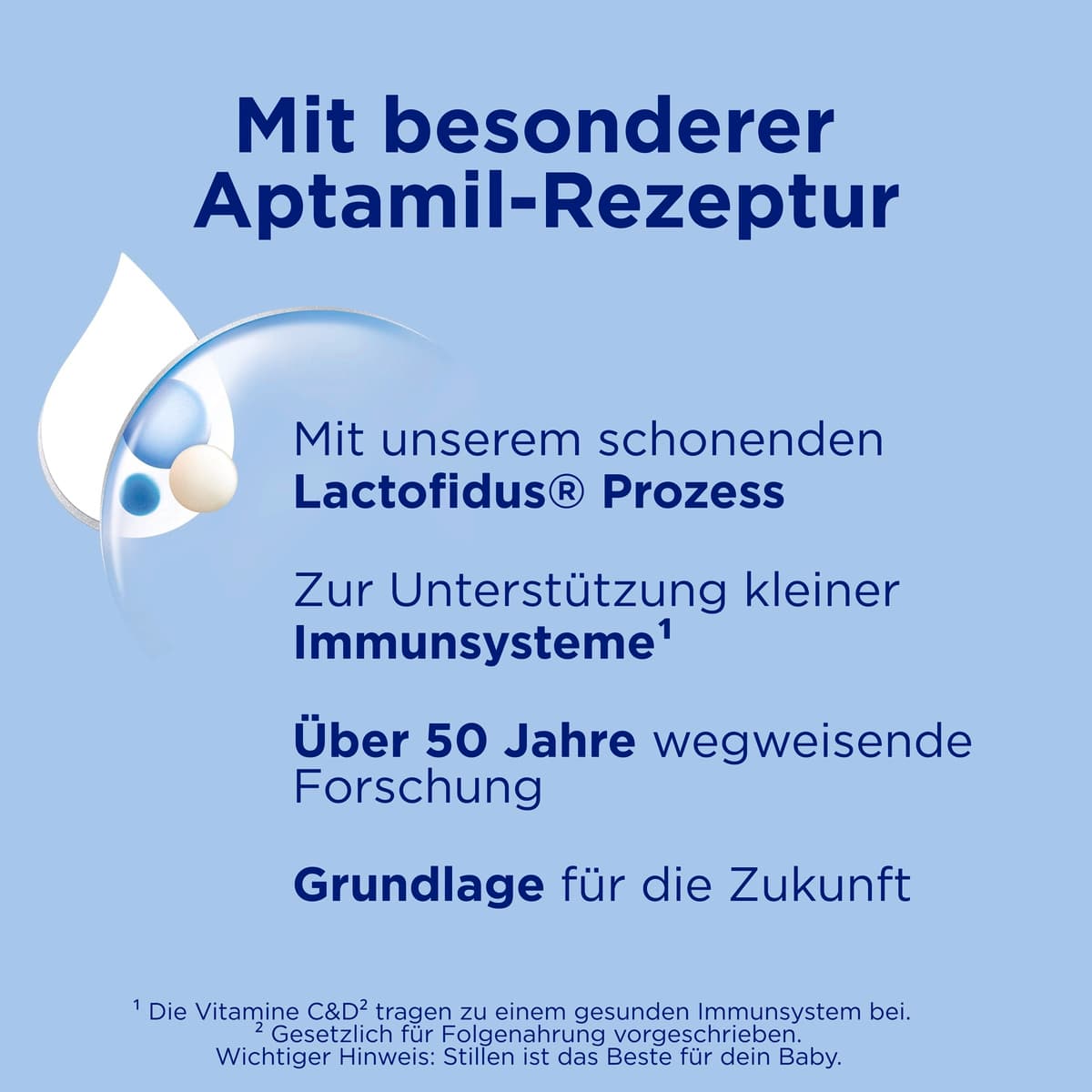 Die Aptamil Pronutra 2 Folgemilch ist als Bestandteil einer gemischten Ernährung mit Beikost auf die Ernährungsbedürfnisse von Säuglingen nach dem 6. Monat abgestimmt. Die Rezeptur vereint eine besondere Nährstoffkombination mit dem schonenden Lactofidus® Prozess.
