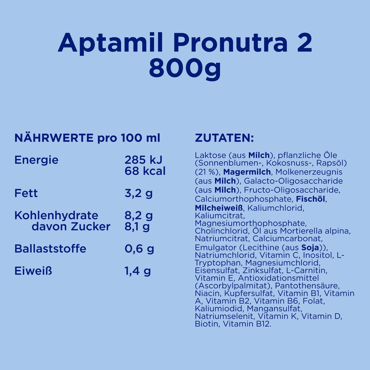 | Zutaten | Laktose (aus MILCH), pflanzliche Öle (Sonnenblumen-, Kokosnuss-, Rapsöl) (21 %), MAGERMILCH, Molkenerzeugnis (aus MILCH), Galacto-Oligosaccharide (aus MILCH), Fructo-Oligosaccharide, Calciumorthophosphate, FISCHÖL, Molkeneiweiß (aus MILCH) Kaliumchlorid, Kaliumcitrat, Magnesiumhydrogenphosphat, Cholinchlorid, Öl aus Mortierella alpina, Natriumcitrat, Calciumcarbonat, Emulgator (Lecithine (aus SOJA)), Natriumchlorid, Vitamin C, Inositol, L-Tryptophan, Magnesiumchlorid, Eisensulfat, Zinksulfat, L-Carnitin, Vitamin E, Antioxidationsmittel (Ascorbylpalmitat), Pantothensäure, Niacin, Kupfersulfat, Vitamin B1, Vitamin A, Vitamin B2, Vitamin B6, Folsäure, Kaliumiodid, Mangansulfat, Natriumselenit, Vitamin K, Vitamin D, Biotin, Vitamin B12 |