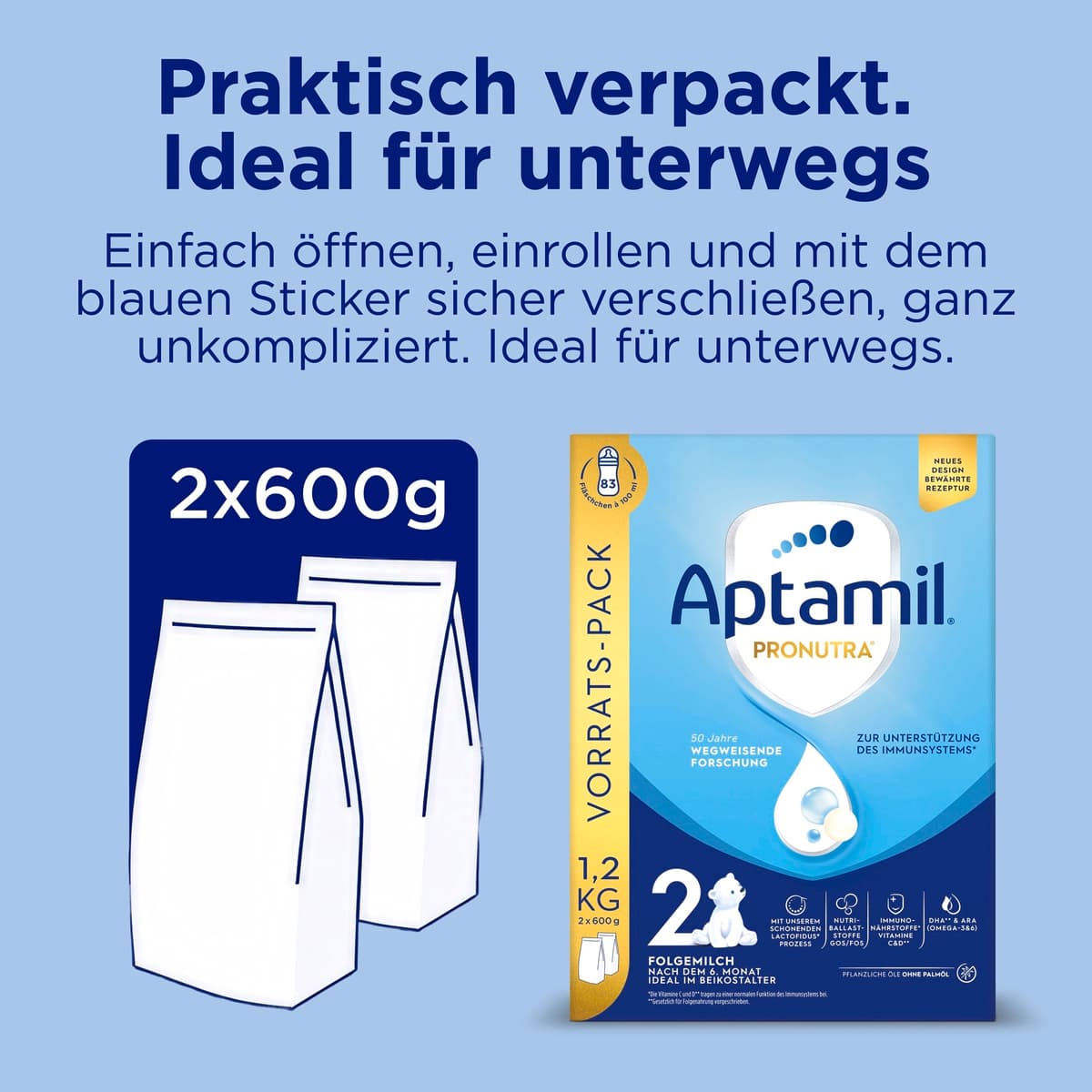Die Folgenahrung enthält neben den Nutri-Ballaststoffen GOS/FOS auch DHA (Docosahexaensäure) und ARA (Arachidonsäure). Die gesetzlich für Folgenahrung vorgeschriebene Zugabe von DHA gehört zur Familie der Omega-3-Fettsäuren. Die Verpackung sollte stets trocken und vor Wärme geschützt aufbewahrt werden. Nach dem Öffnen ist der Inhalt des jeweiligen Innenbeutels innerhalb von vier Wochen zu verbrauchen.