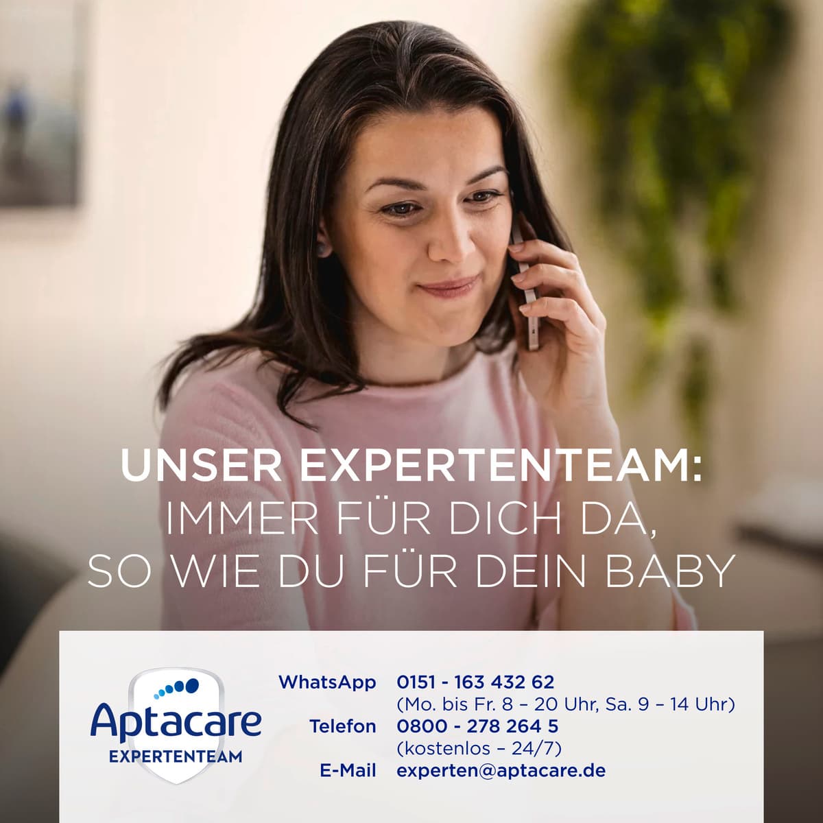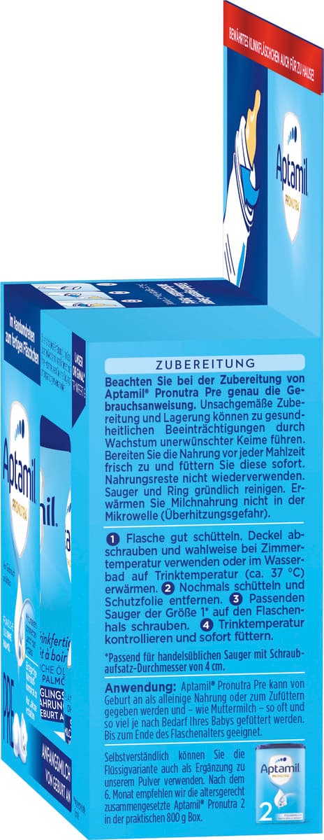 | Zubereitungshinweis | Zubereitung: Beachten Sie bei der Zubereitung von Aptamil Pre genau die Gebrauchsanweisung. Unsachgemäße Zubereitung und Lagerung können zu gesundheitlichen Beeinträchtigungen durch Wachstum unerwünschter Keime führen. Bereiten Sie die Nahrung vor jeder Mahlzeit frisch zu und füttern Sie diese sofort. Nahrungsreste nicht wiederverwenden. Sauger und Ring gründlich reinigen. Erwärmen Sie Milchnahrung nicht in der Mikrowelle (Überhitzungsgefahr). 1 Flasche gut schütteln. Deckel abschrauben und wahlweise bei Zimmertemperatur verwenden oder im Wasserbad auf Trinktemperatur (ca. 37°C) erwärmen. 2 Nochmals schütteln und Schutzfolie entfernen. 3 Passenden Sauger der Größe 1* auf den Flaschenhals schrauben. 4 Trinktemperatur kontrollieren und sofort füttern. * Passend für handelsübliche Sauger mit Schraubaufsatz-Durchmesser von 4cm. |