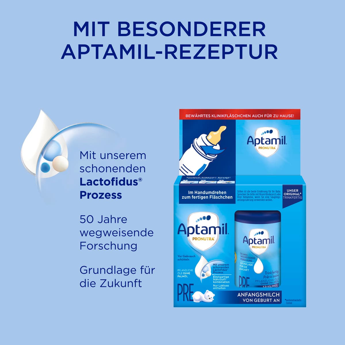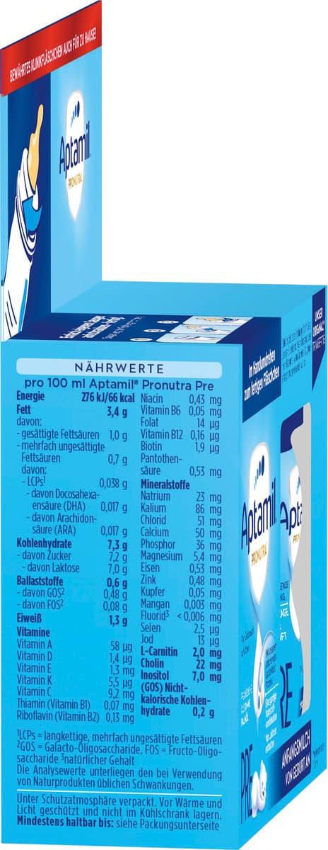| Anwendungshinweis | Trinkfertig - Vor Gebrauch schütteln. Anwendung: Aptamil Pronutra Pre kann von Geburt an als alleinige Nahrung oder zum Zufüttern gegeben werden und – wie die Muttermilch – so oft und so viel je nach Bedarf Ihres Babys gefüttert werden. Bis zum Ende des Flaschenalters geeignet. Einfach eigenen Sauger aufschrauben - fertig. Im Handumdrehen zum fertigen Fläschchen. Stillen ist die beste Ernährung für Ihr Baby. Sprechen Sie bitte mir Ihrem Kinderarzt oder Ihrer Hebamme, wenn Sie eine Säuglingsanfangsnahrung verwenden wollen. |