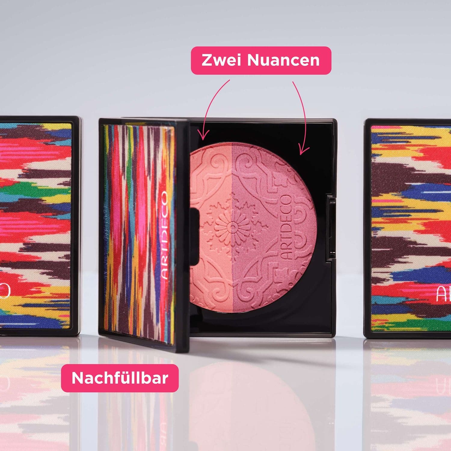 AnwendungshinweisMit einem Blusherpinsel die Farben miteinander vermischen und der Gesichtsform entsprechend auf die Wangenpartie auftragen. Die Farben können auch einzeln verwendet werden.Zum Nachfüllen der Dose in folgenden Schritten vorgehen: - Mittlere Lasche anheben - Aufgebrauchten Puder herausnehmen - Neuen Puder einsetzen - Mittlere Lasche schließen