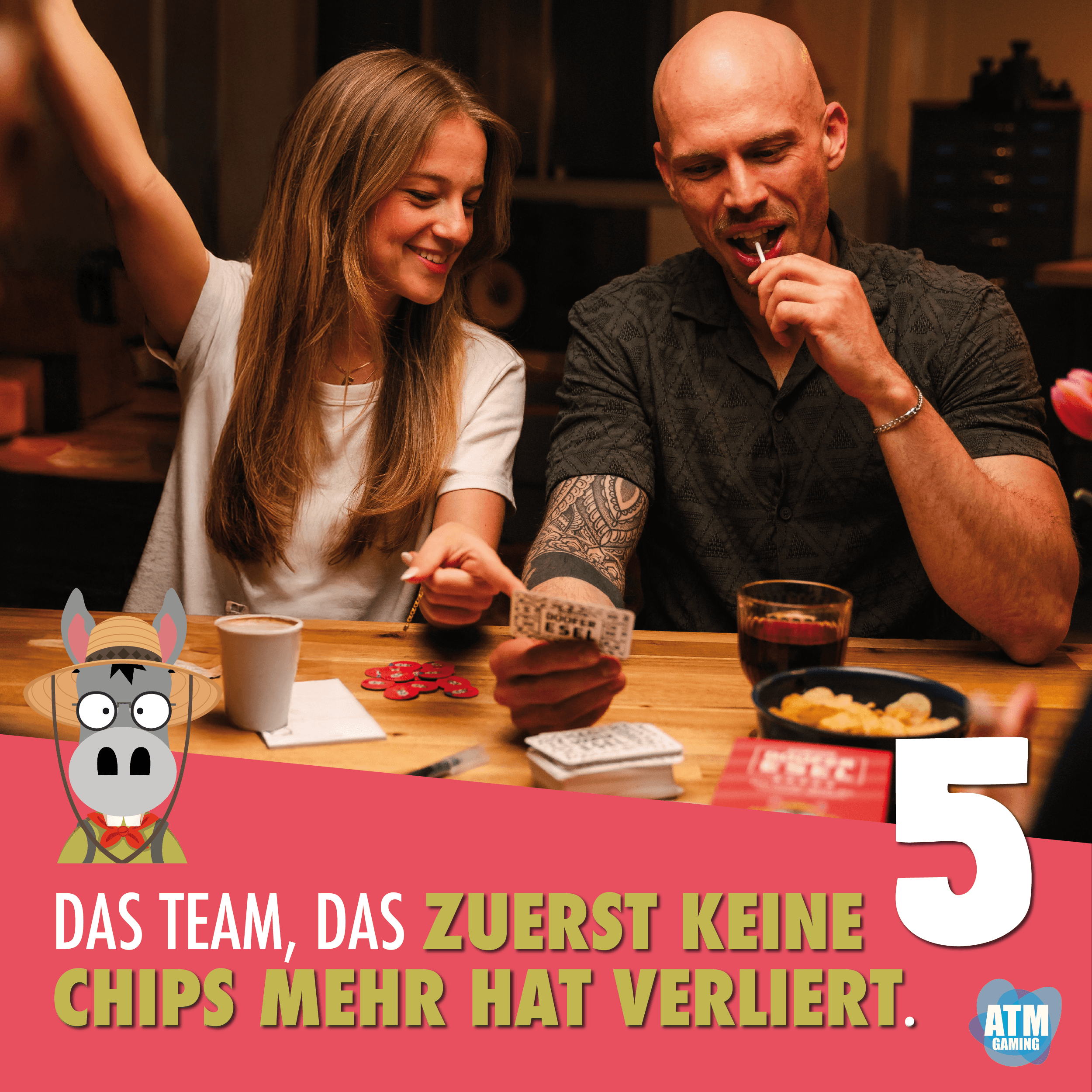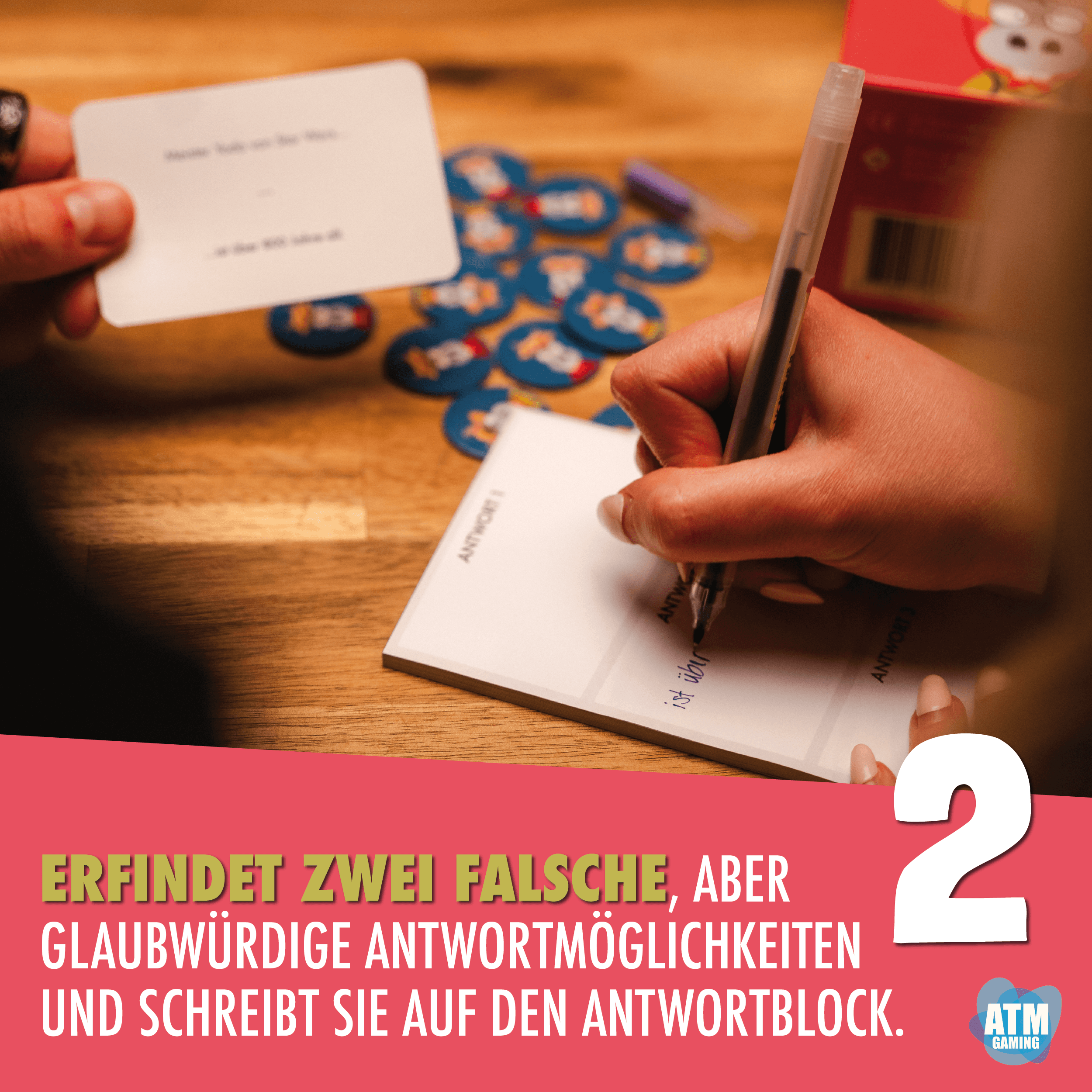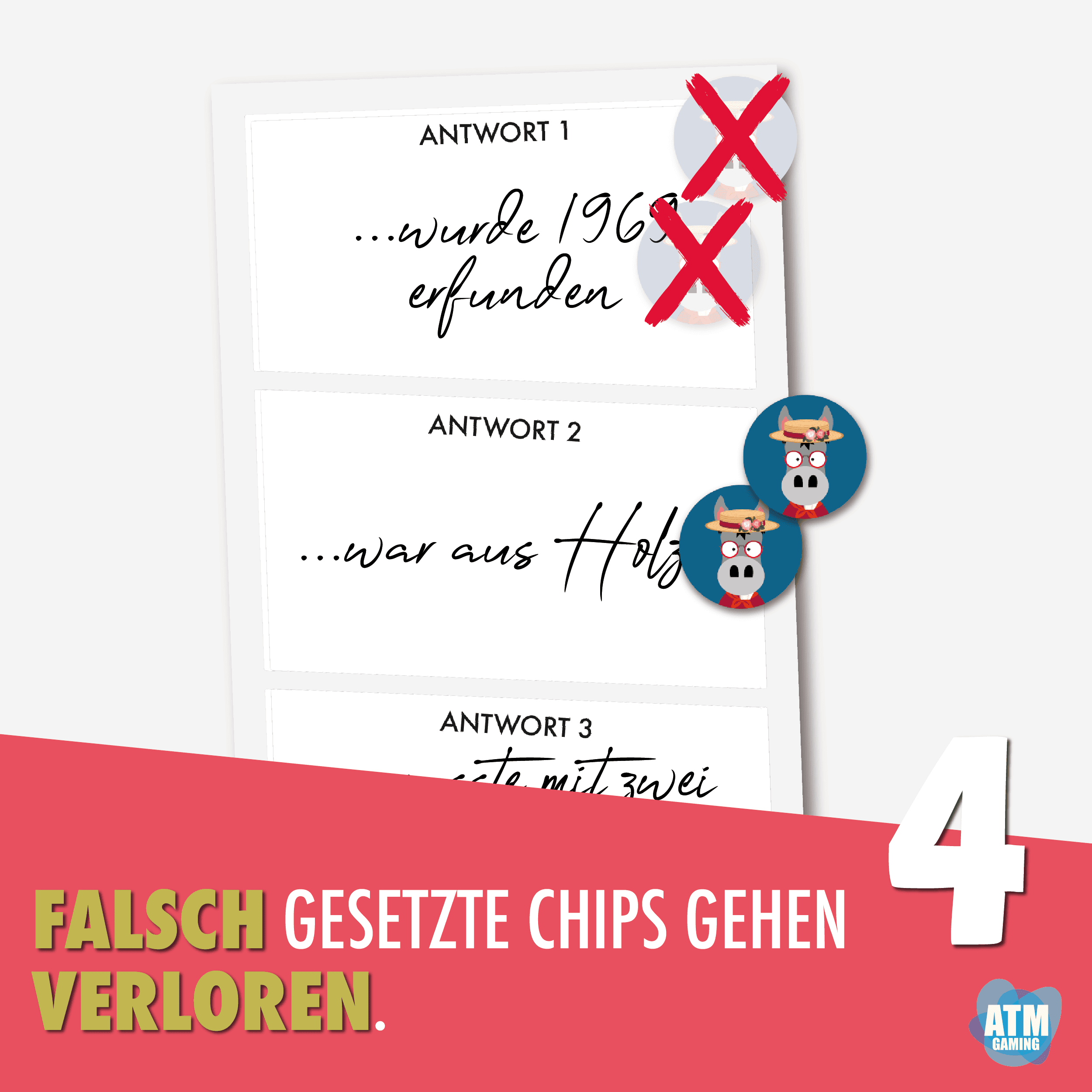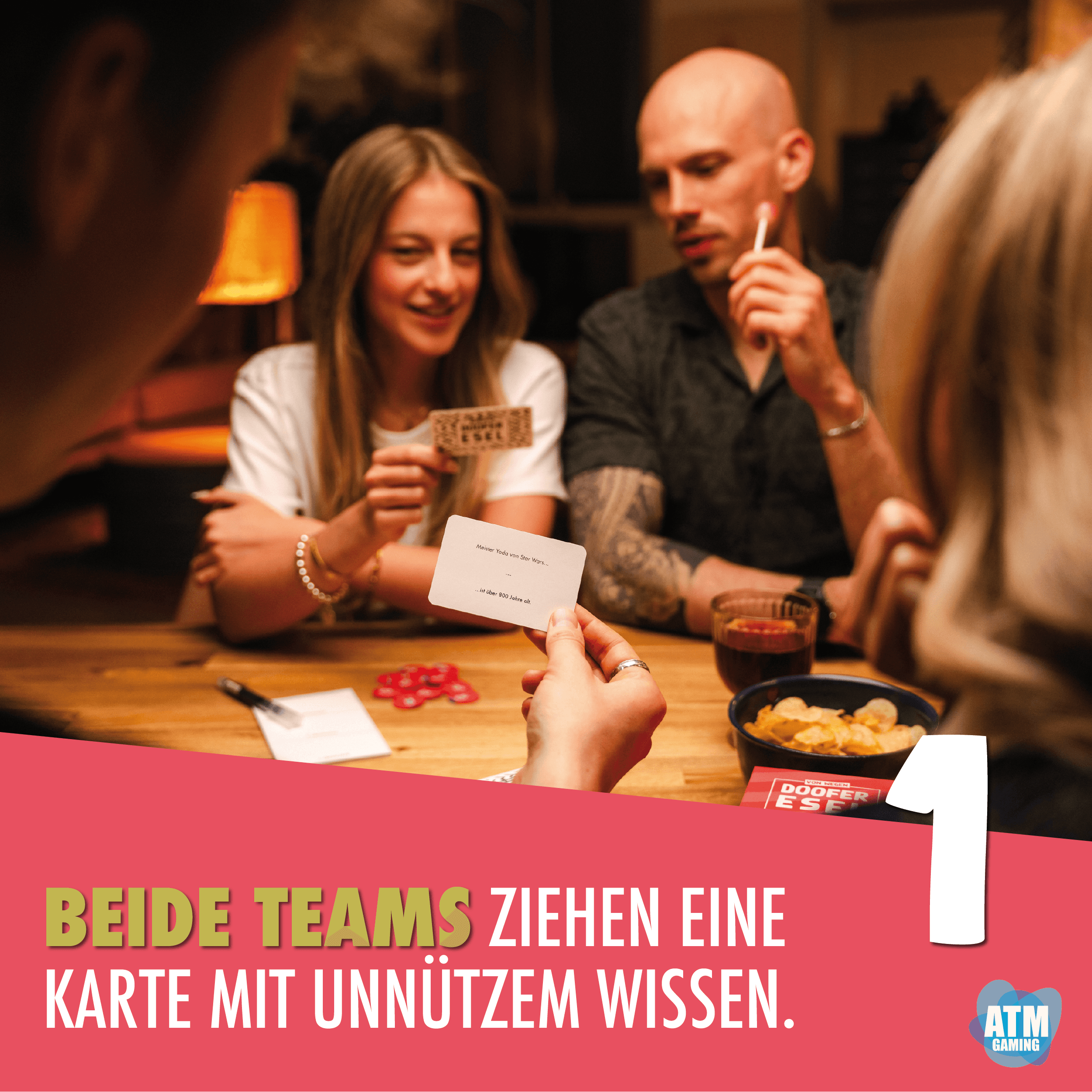 Doofer Esel ist ein lustiges und kreatives Kartenspiel bei dem dein unnützes Wissen und ein guter Bluff gefragt sind. Ideal für unterhaltsame Spieleabende mit Freunden oder der Familie!Erfindet im Team falsche Antwortmöglichkeiten auf skurrile Fragen und erzeugt möglichst gute Bluffs, damit euch das andere Team glaubtDoofer Esel ist ein wunderbares Spiel für alle Generationen. Lustig, aber nicht vulgär. Perfekt für Familien, Spieleabende mit Freunden und auch als lustiges GeschenkSpielverlauf: 1. Teilt euch in zwei Teams. Das erste Team zieht eine Frage. 2. Erfindet zwei weitere Antwortmöglichkeiten und schreibt alle Antworten auf den Block. 3. Das andere Team setzt Chips auf die Antworten. 4. Chips auf falschen Antworten scheiden aus. Wer zuerst keine Chips mehr hat, verliert das SpielFür 2-10 Spieler und 15-20 Minuten perfekte Unterhaltung pro SpielrundeDesigned in Deutschland und produziert in Europa unter Verwendung umweltschonender Rohstoffe.