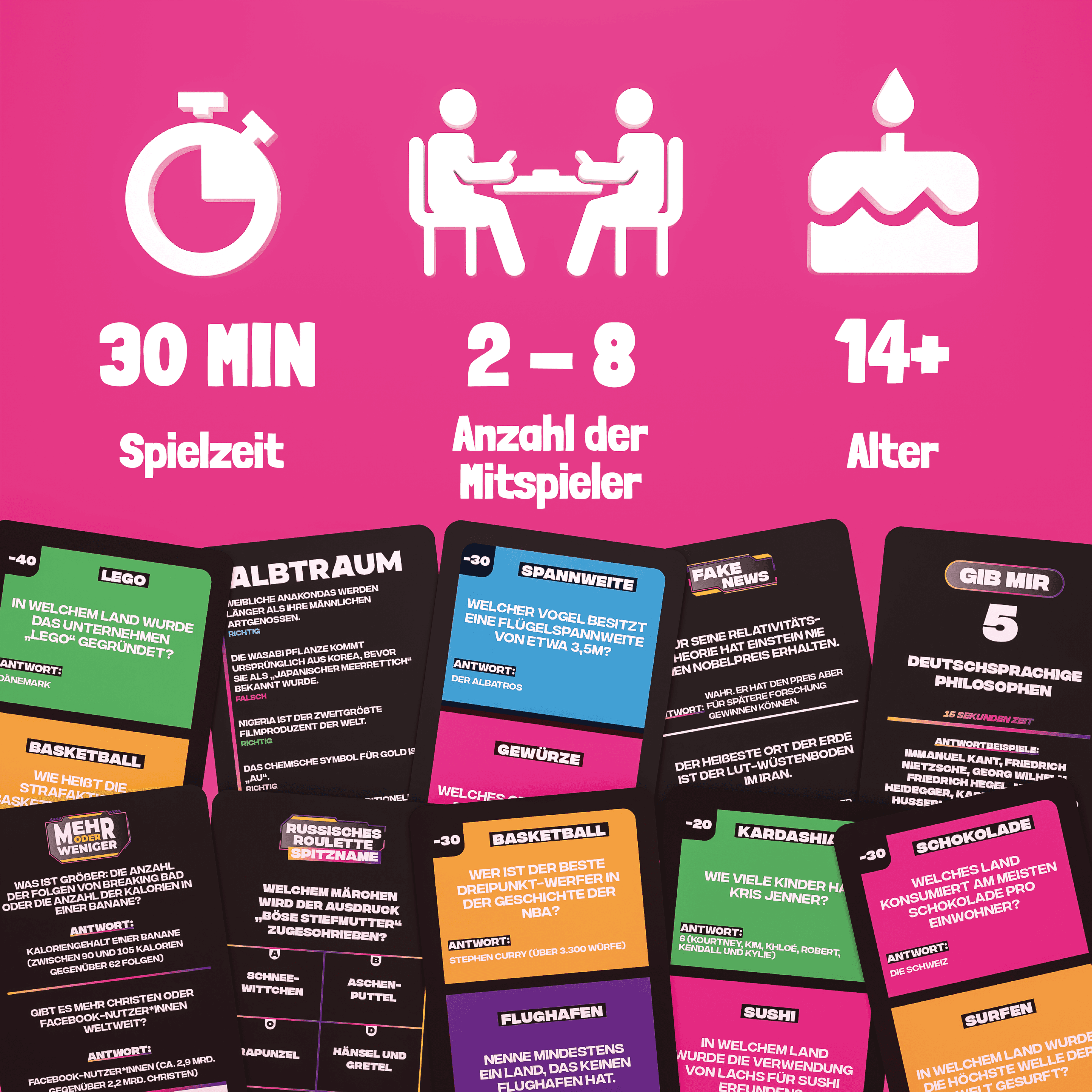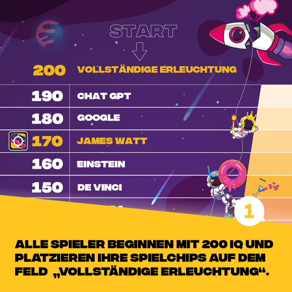 Ziel des Spiels: Beantworte die Fragen richtig, um nicht ins schwarze Loch zu fallen. Jede falsche Antwort kostet dich Punkte und bringt dich dem schwarzen Loch näher. Der erste Spieler, der hineinfällt verliert das Spiel