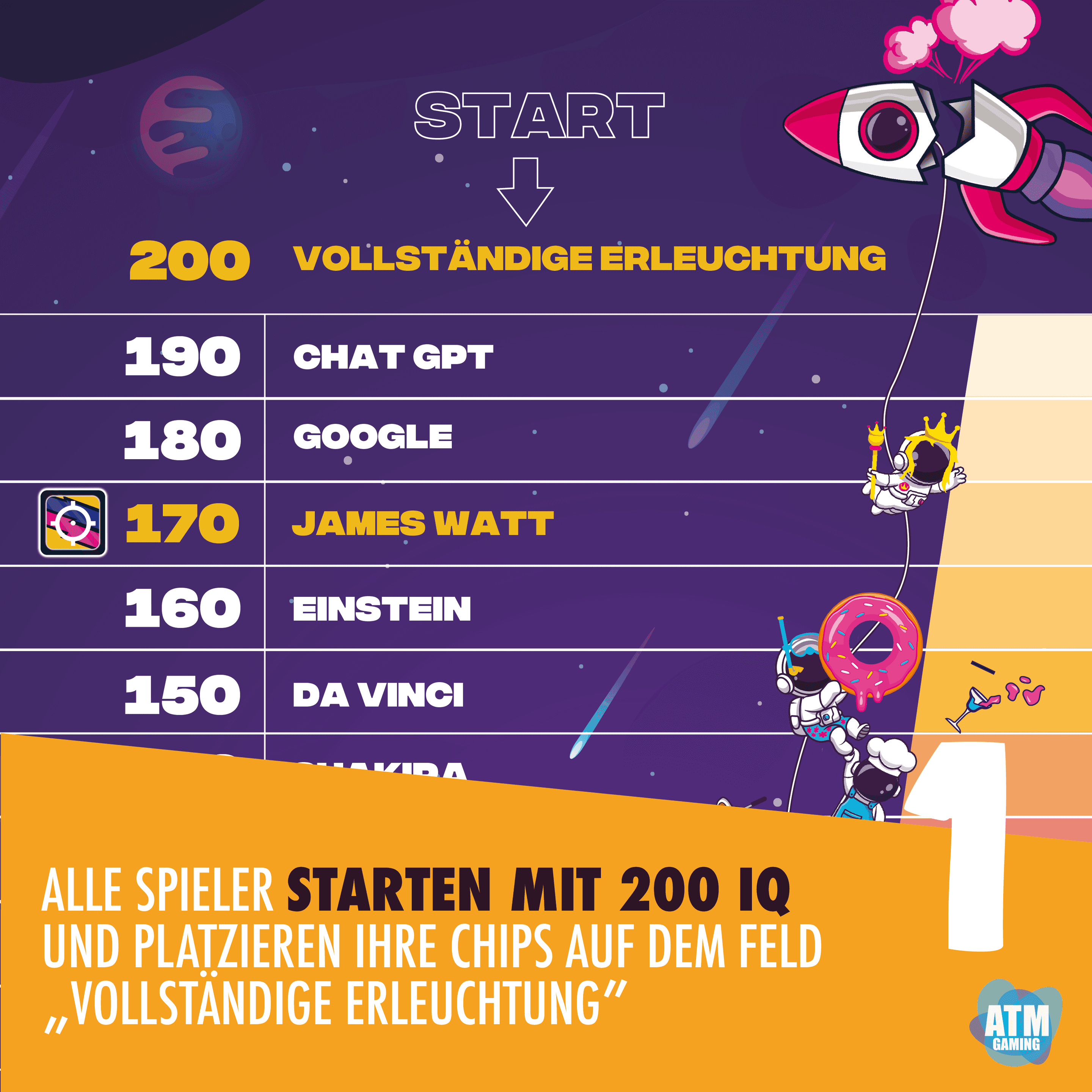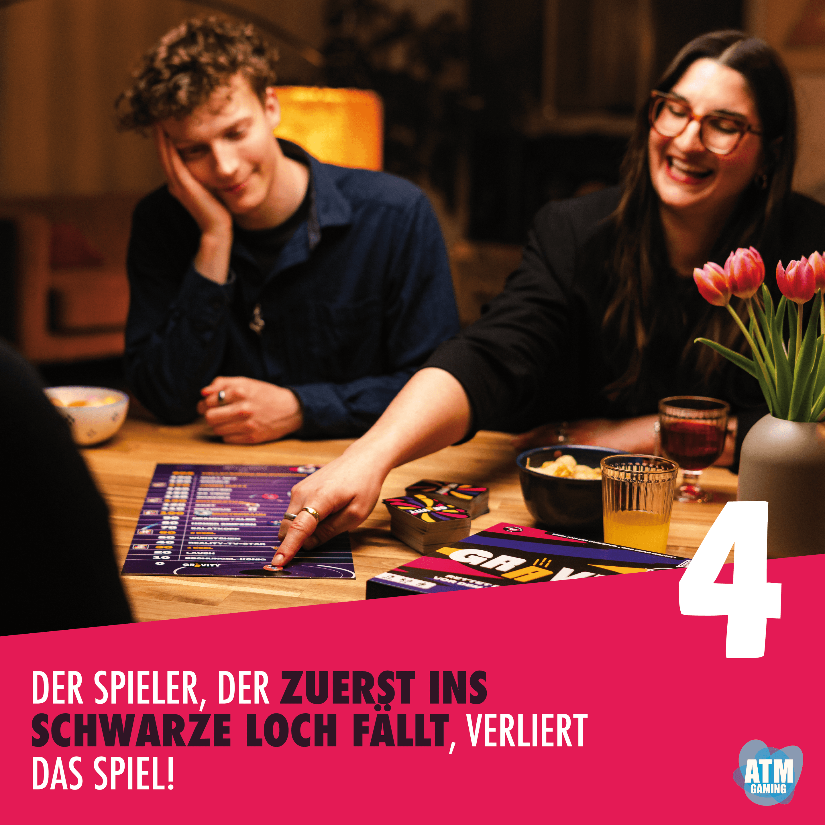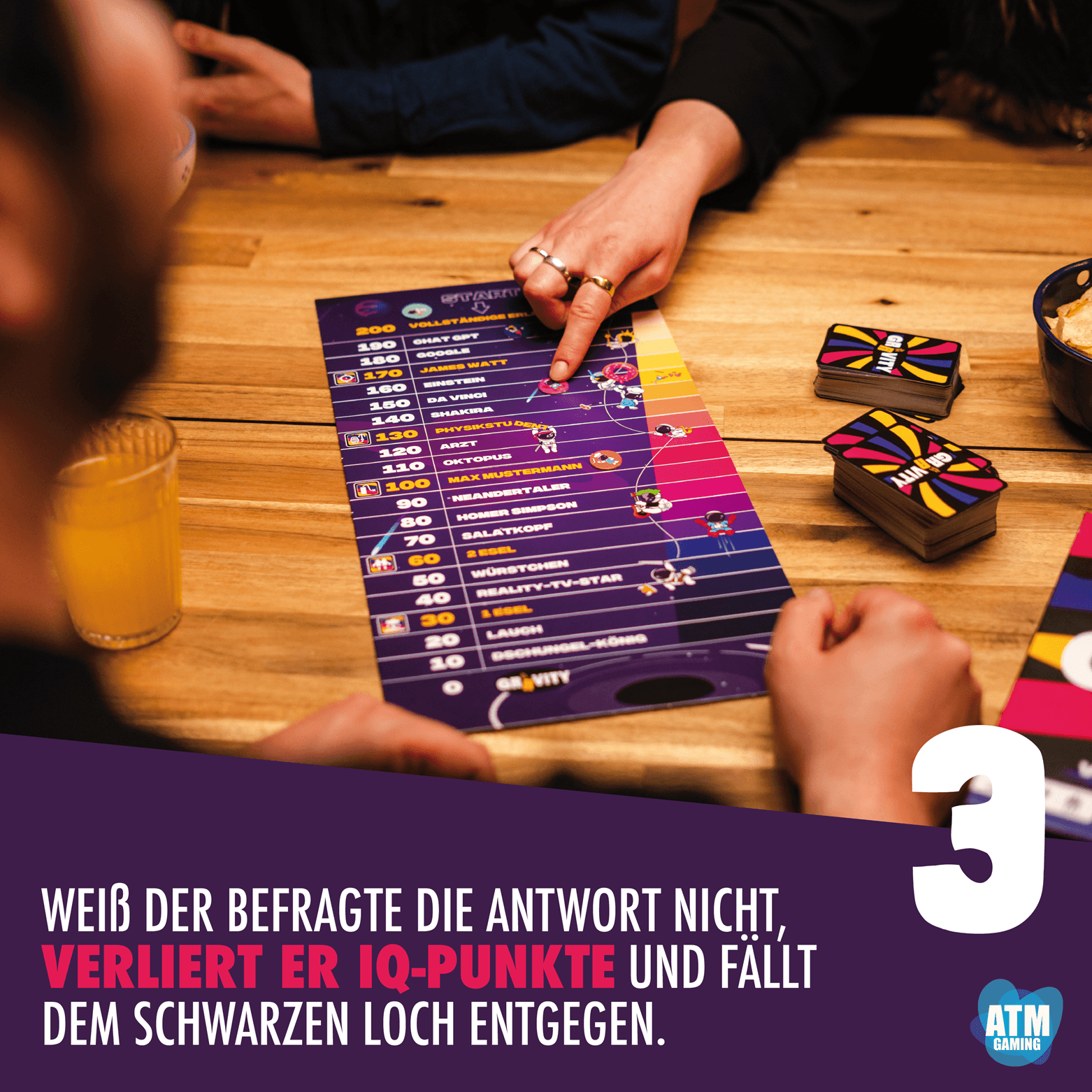 Sei strategisch: Einige Felder ermöglichen es dir, den Spielverlauf umzukehren und deine Gegner ins schwarze Loch zu stoßen! Als Mischung aus Partyspiel und Wissensspiel ist Gravity das ideale Gesellschaftsspiel für deine Abende mit Freunden oder der Familie!