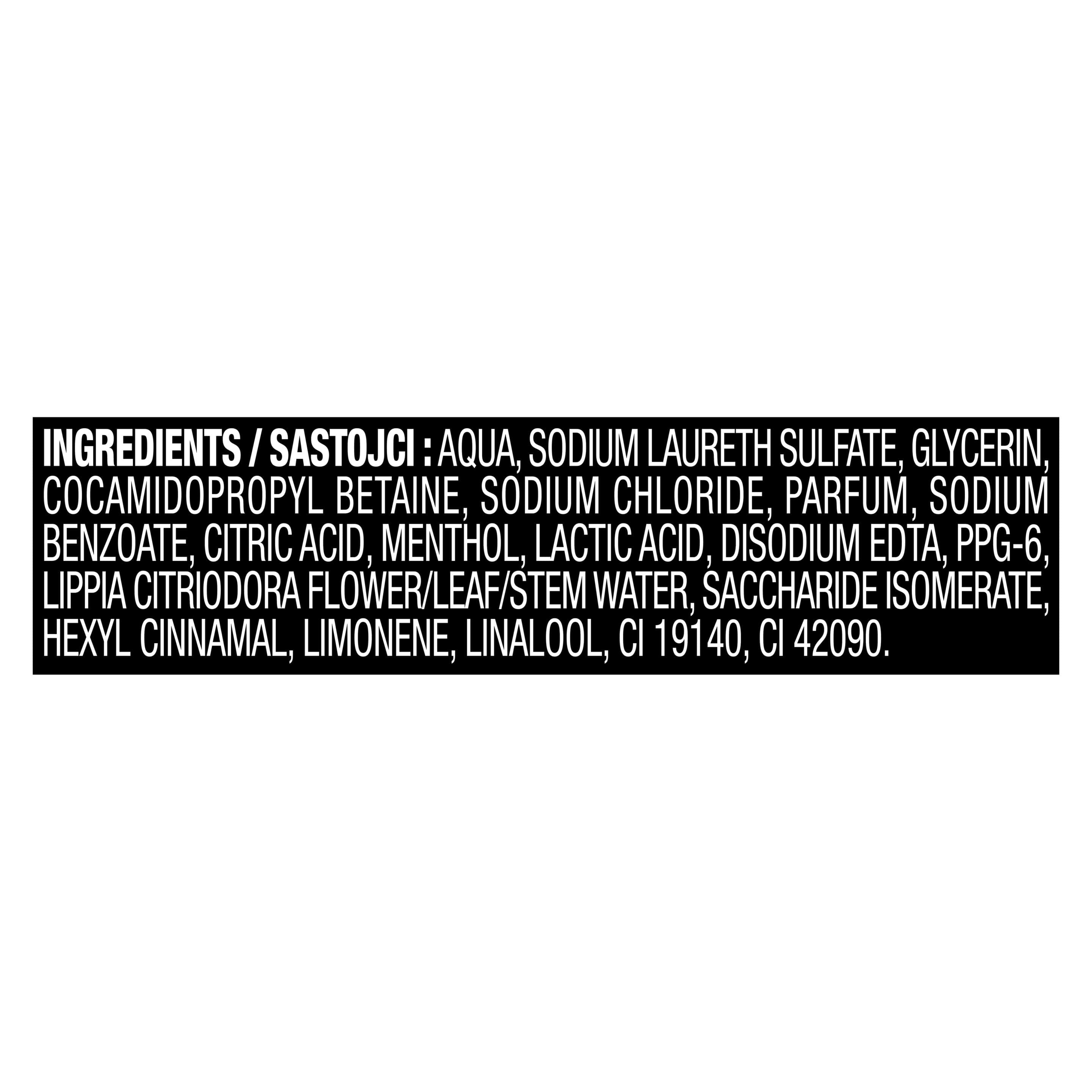 | Inhaltsstoffe | Aqua, Sodium Laureth Sulfate, Glycerin, Cocamidopropyl Betaine, Sodium Chloride, Parfum, Sodium Benzoate, Citric Acid, PPG-6, Menthol, Lactic Acid, Disodium EDTA, Lippia Citriodora Flower/Leaf/Stem Water, Saccharide Isomerate, Benzyl Salicylate, Limonene, CI 19140, CI 42090. |