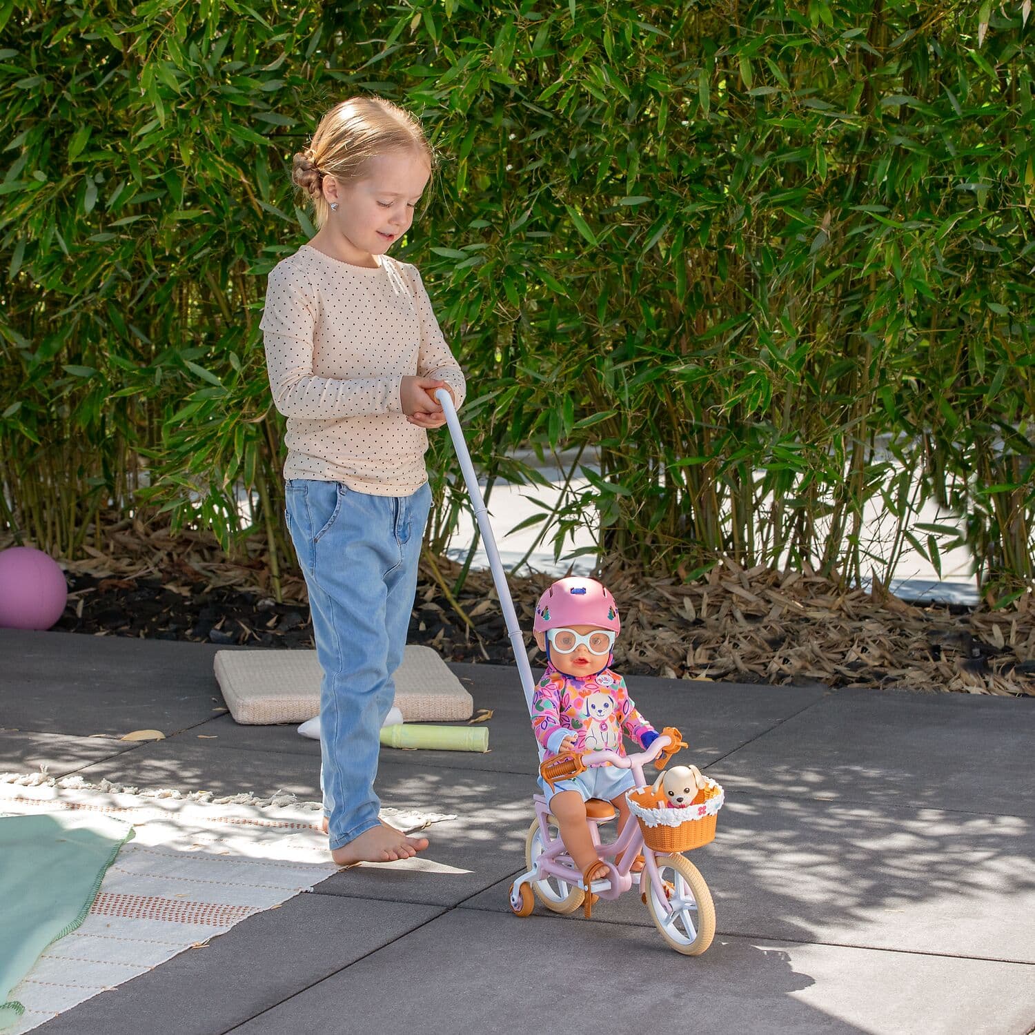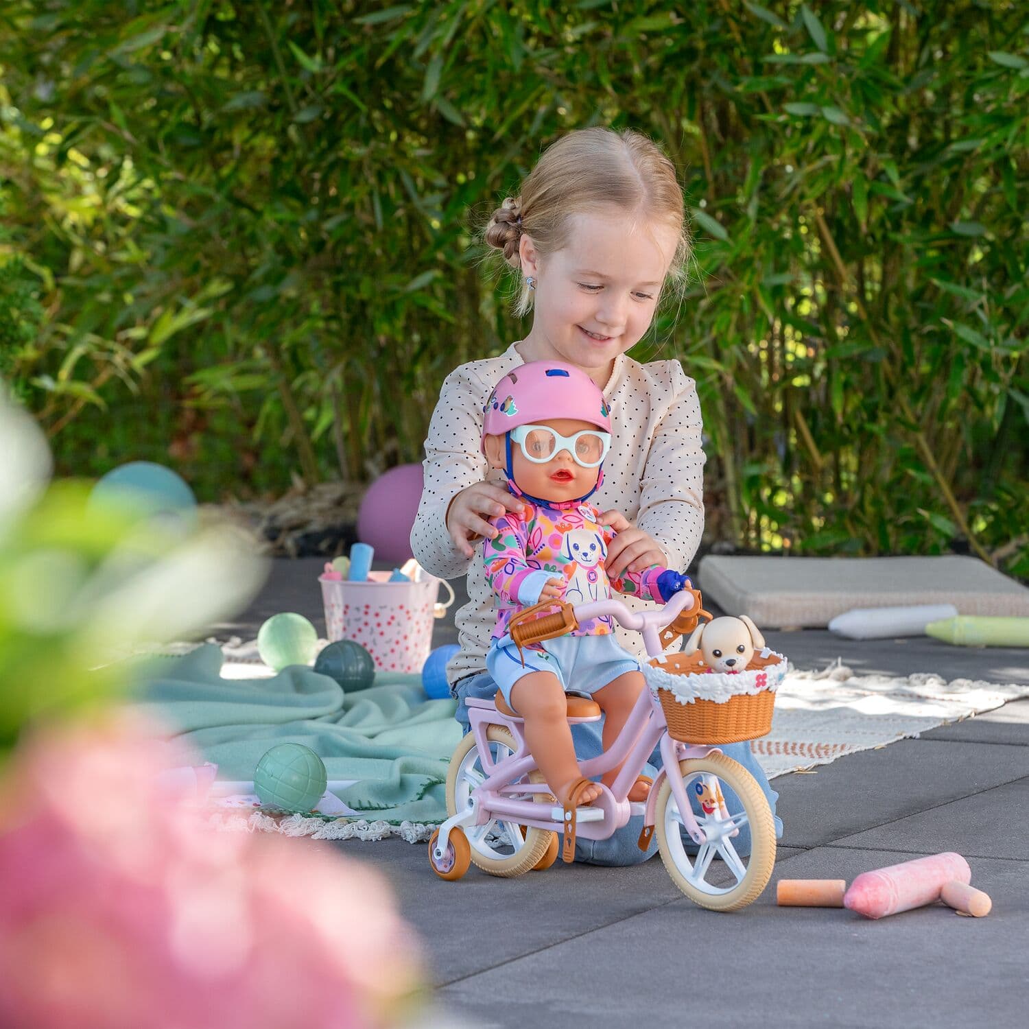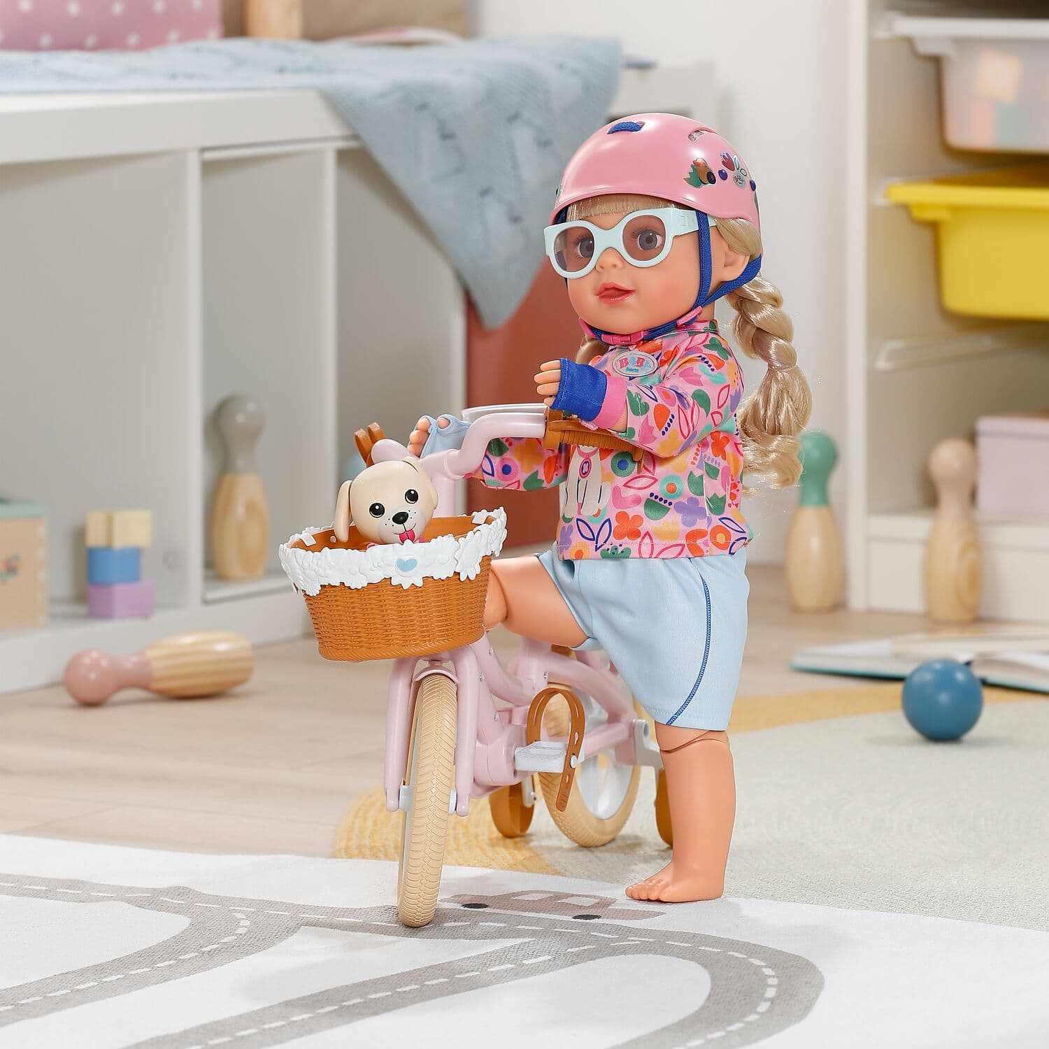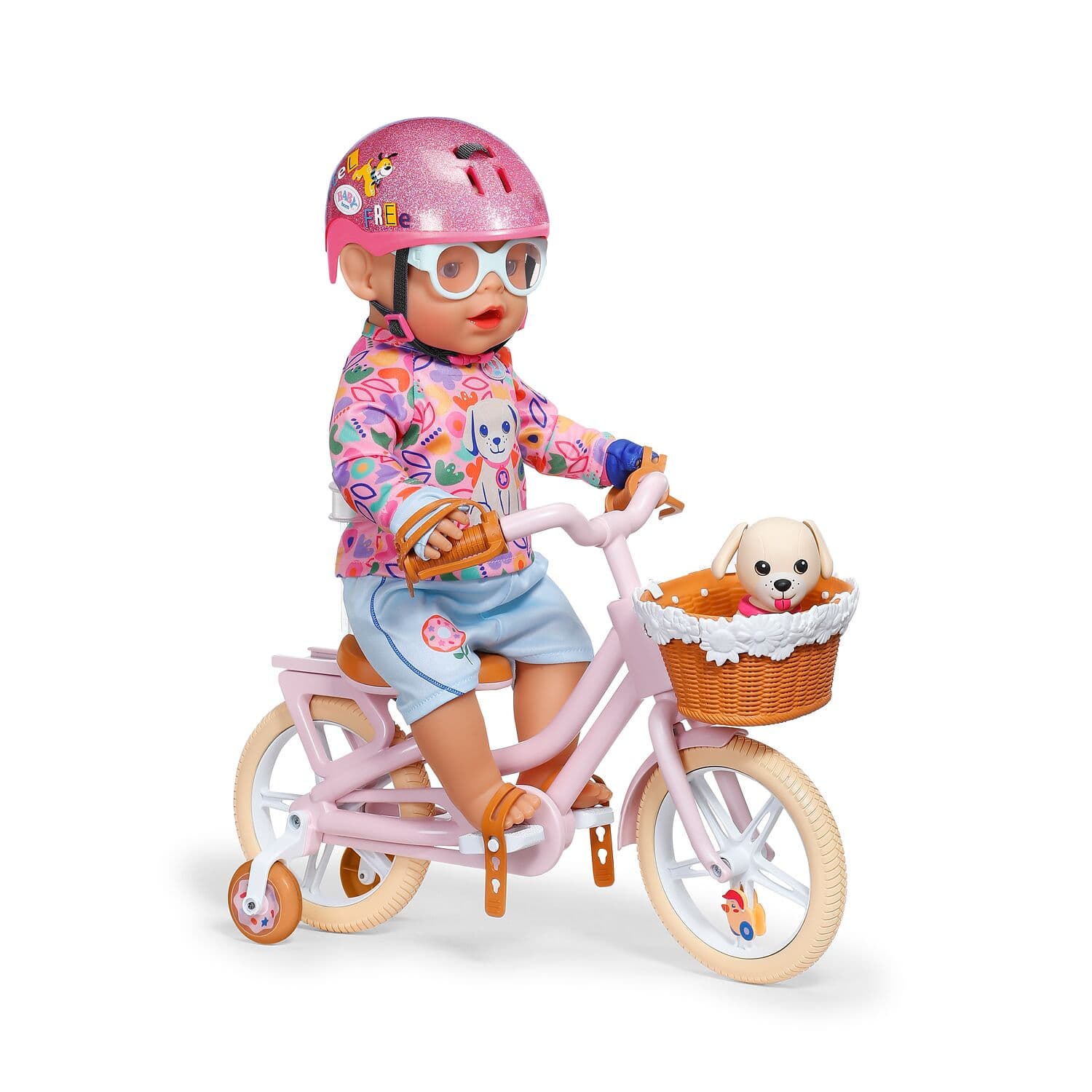 Mit dem rosa Holland-Rad geht es nicht nur für BABY born Emma auf Tour - auch der kleine Welpe Lucky findet im Fahrradkörbchen seinen Platz.