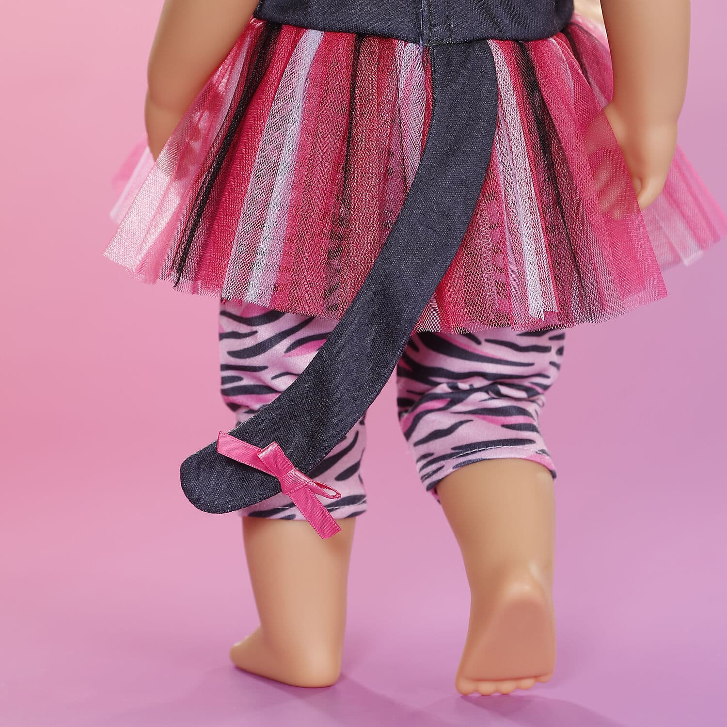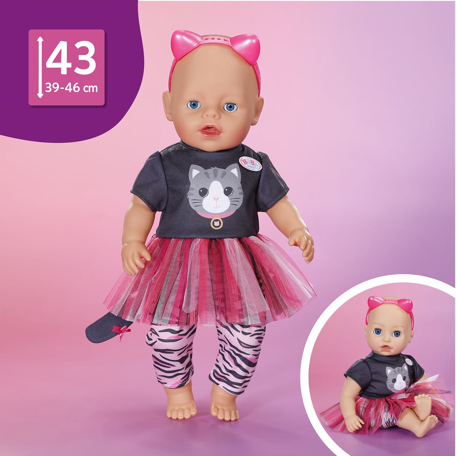 Das verspielte Katzen-Outfit mit Tüllrock, Hose und Haarreif bringt tierischen Spaß in den Puppenalltag. Die gestreifte Leggins und die coolen Katzen-Ohren machen es zu einem echten Lieblingsoutfit. Passend für 43 cm Puppen und den BABY born Teddy.