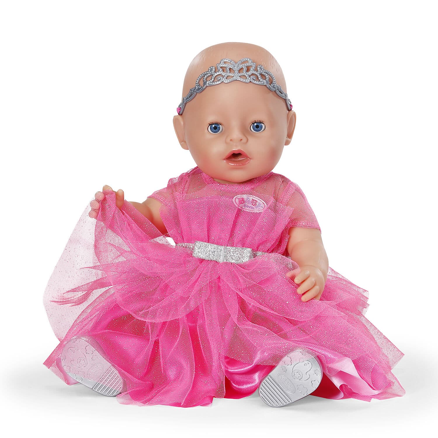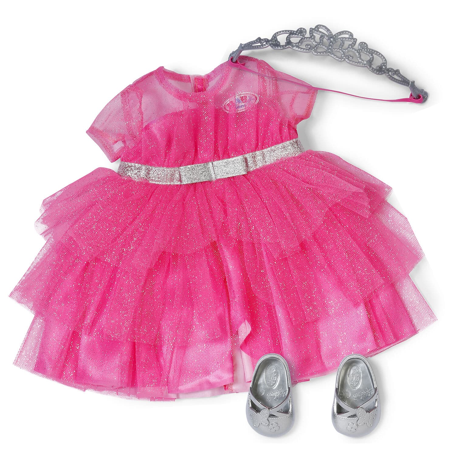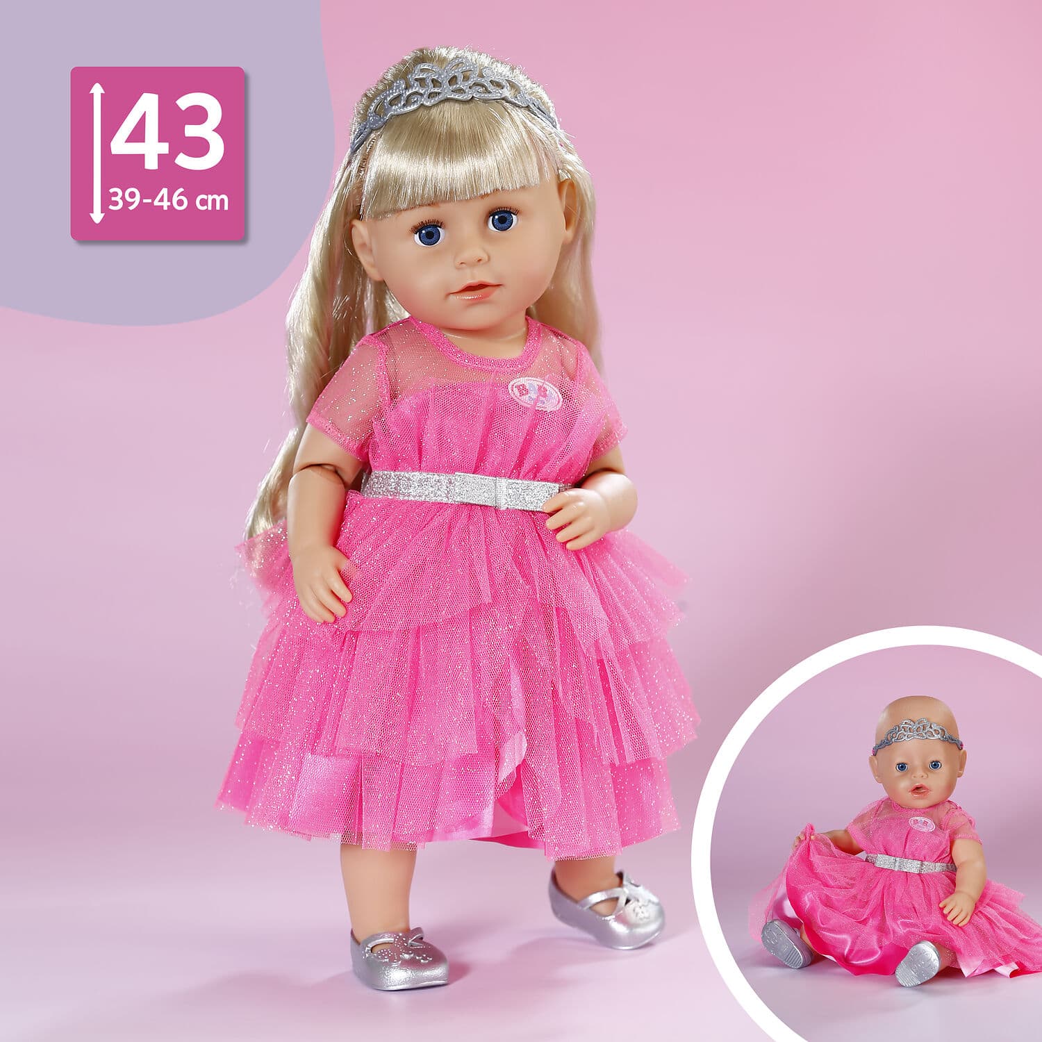 Mit dem Prinzessinnen-Outfit wird BABY born zur kleinen Königin. Das rosa Kleid glitzert zart, die silbernen Schuhe und die Tiara vervollständigen den royalen Look. Ideal für Märchenstunden und königliche Feste im Puppenschloss.