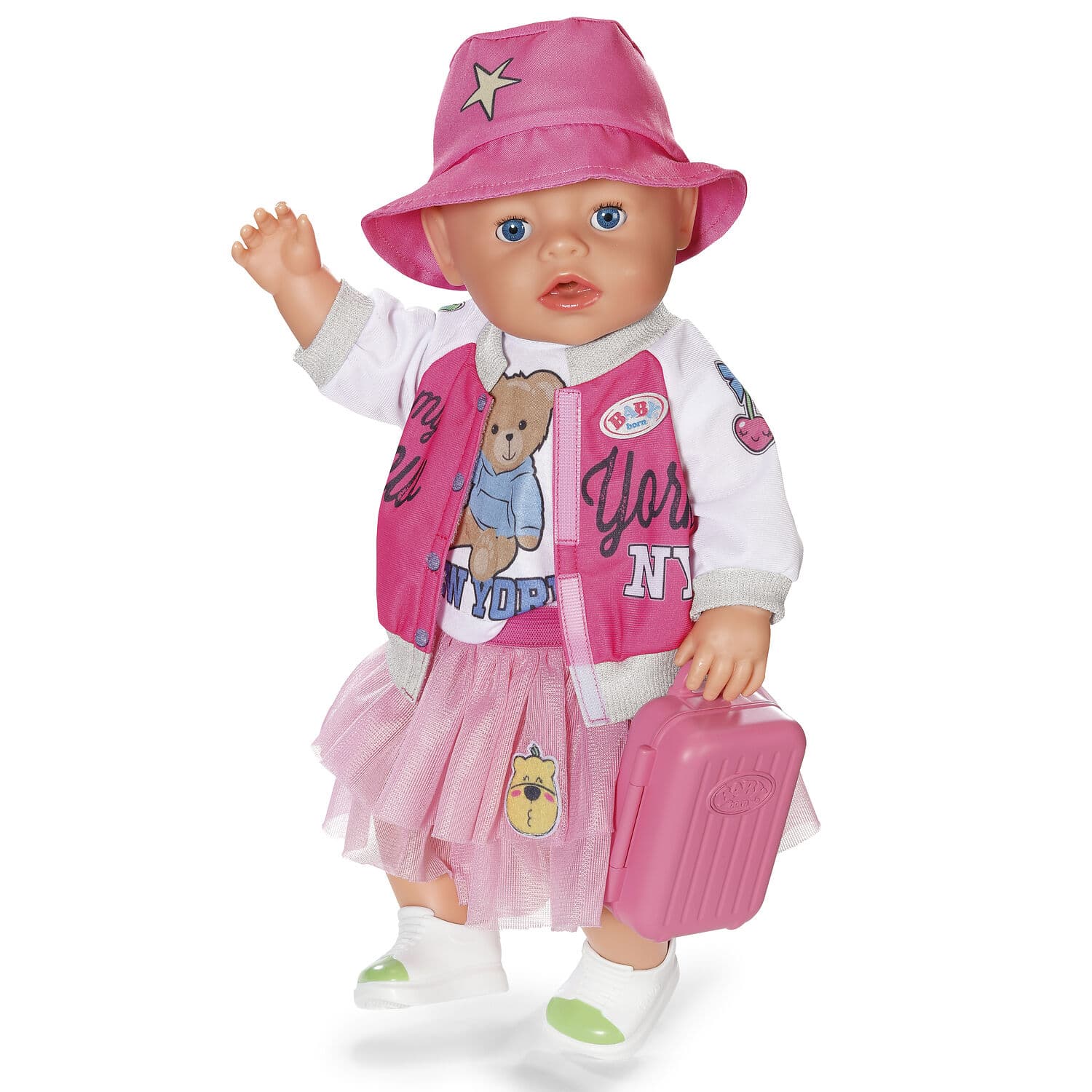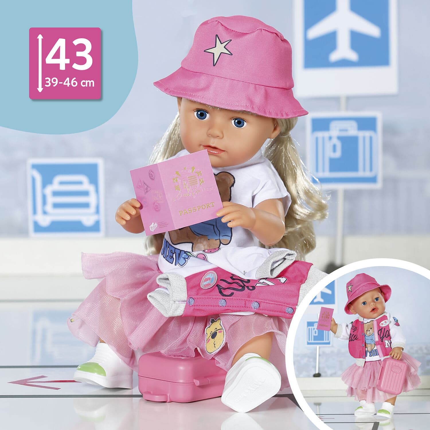 BABY born's Reise-Outfit besteht aus Schuhen, Jacke, Hut, Shirt und Tüllrock, einem kleinen Köffcherchen und Reisepass. Alles bereit zum Abflug?