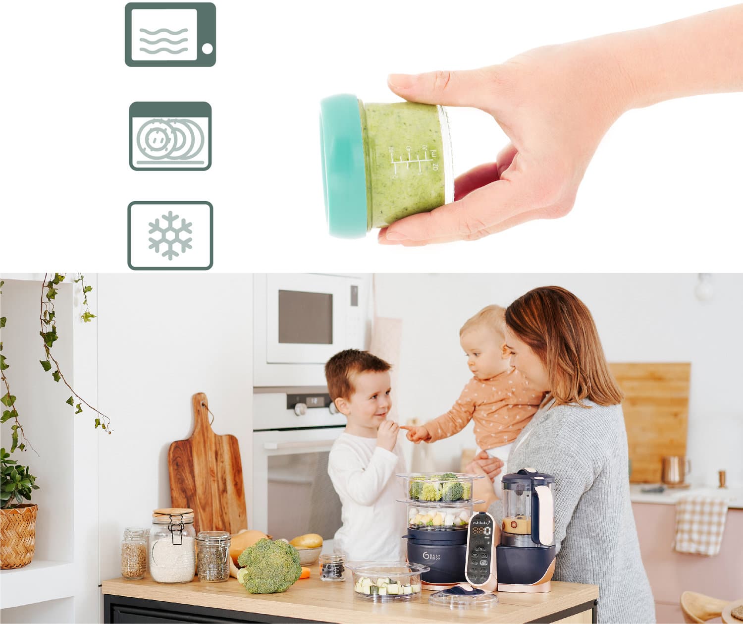 Zur einfachen Aufbewahrung lassen sich die Babybol-Vorratsbehälter im Schrank, Kühl- oder Gefrierfach stapeln. Dank der Beschaffenheit aus Glas sind die Aufbewahrungsbehälter hitzeresistent. Sie können in der Mikrowelle, im Wasserbad oder im Flaschenwärmer erwärmt werden. Zudem sind sie spülmaschinenfest und sterilisierbar. Das besondere Plus der kleinen Helferlein? Sie sind langlebig, verfärben sich nicht bei Kontakt mit Lebensmitteln wie Karotten oder Tomaten und sind recycelbar. Jetzt kann die Beikostphase beginnen!