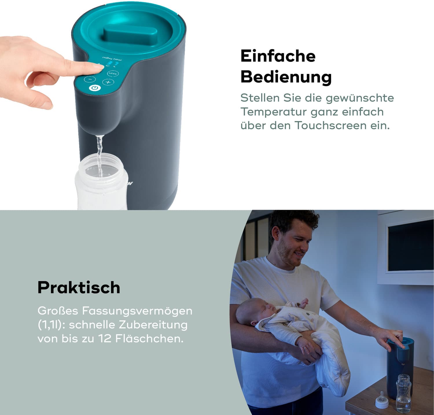 Dank seines großen Fassungsvermögens von 1,1 Liter und der Wasserwarmhalt-Funktion können Sie die Milch Ihres Babys zu jeder Tages- und Nachtzeit schnell und effizient zubereiten. Das Wasser verbleibt in der von Ihnen programmierten Temperatur und Sie müssen nur aufs Knöpfchen drücken.
