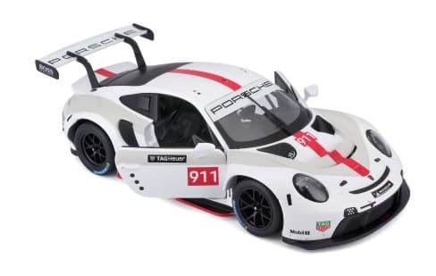 „Porsche 911 RSR GT (2020)": Modellauto im Maßstab 1:24, Türen beweglich, weiß (18-28013)911 RSR GT: Hinter dieser Kombination an Zahlen und Buchstaben verbirgt sich der kompromissloseste Langstreckensportwagen den Porsche je gebaut hat. „911“ ist zum Sinnbild für Sportwagen geworden, der Zusatz „RSR“ steht für die reine Wettkampfversion ohne Straßenzulassung und mit „GT“ vollendet Porsche die Perfektion als Langstreckenrennwagen. Bburago hat den 515 PS starken Rennwagen nun originalgetreu und detailverliebt nachgebildet. Das Auto überzeugt mit detailgetreuem Interieur und beweglichen Türen. Das Sammlerauto ist ein Muss für jeden Porsche-Fan und ein Blickfang für die Vitrine! Als Spielzeug eignet sich der Modellwagen mit einer Größe von ca. 19 cm für Kinder ab 3 Jahren.