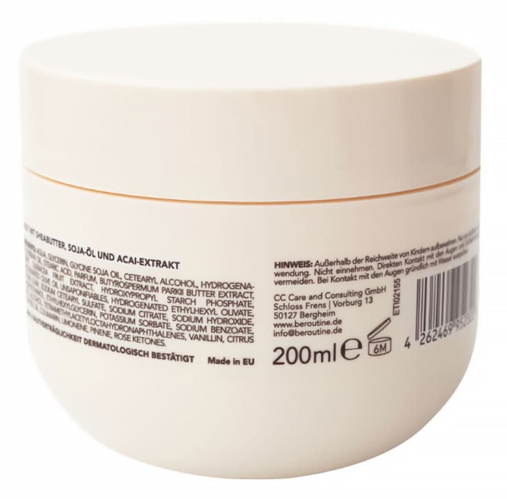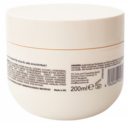 | Inhaltsstoffe | INGREDIENTS: AQUA, GLYCERIN, GLYCINE SOJA OIL, CETEARYL ALCOHOL, HYDROGENATED SOYBEAN OIL, STEARIC ACID, PARFUM, BUTYROSPERMUM PARKII BUTTER EXTRACT, EUTERPE OLERACEA FRUIT EXTRACT, HYDROXYPROPYL STARCH PHOSPHATE, HYDROGENATED OLIVE OIL UNSAPONIFIABLES, HYDROGENATED ETHYLHEXYL OLIVATE, XANTHAN GUM, SODIUM CETEARYL SULFATE, SODIUM CITRATE, SODIUM HYDROXIDE, PHENOXYETHANOL, ETHYLHEXYLGLYCERIN, POTASSIUM SORBATE, SODIUM BENZOATE, BENZYL ALCOHOL, TETRAMETHYLACETYLOCTAHYDRONAPHTHALENES, VANILLIN, CITRUS LIMON PEEL OIL, COUMARIN, LIMONENE, PINENE, ROSE KETONES. |