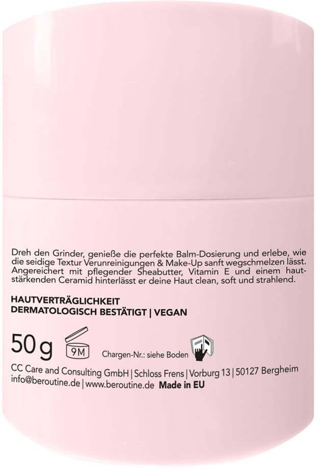Dreh den Grinder des be routine Cleansing Balm und genieße die perfekte Balm-Dosierung. Erlebe, wie die seidige Textur Verunreinigungen & Make-Up sanft wegschmelzen lässt. Angreichert mit pflegender Sheabutter, Vitamin E und einem hautstärkenden Creamid hinterlässt er Deine Haut clean, soft und strahlend.
